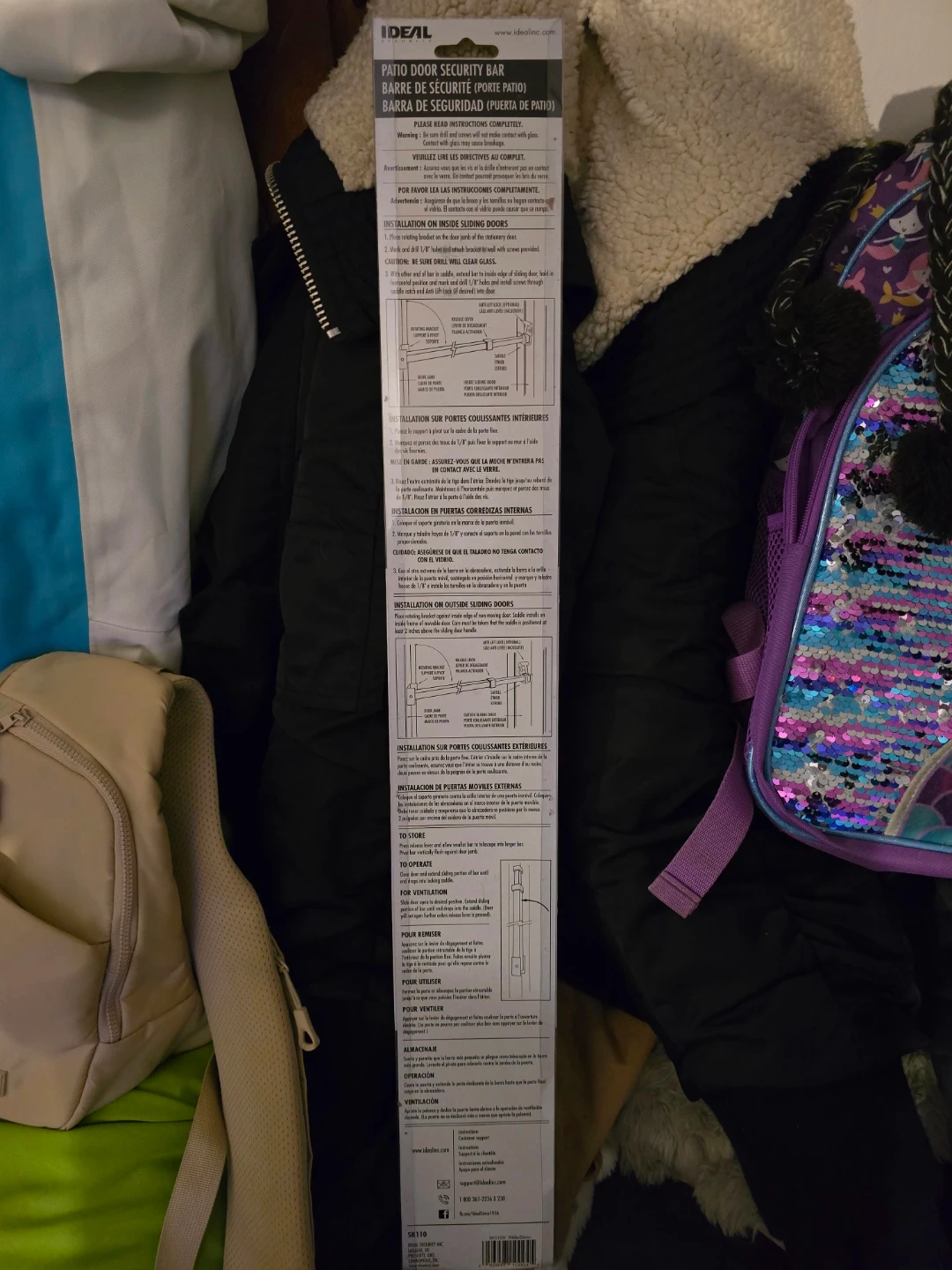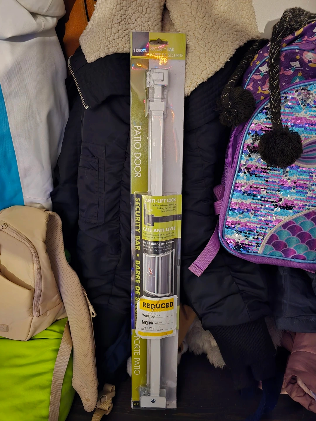 Selling an Ideal Security patio door security bar. It's designed to fit all sliding patio doors and features an anti-lift lock for added security. This security bar is brand new and still in its original packaging!