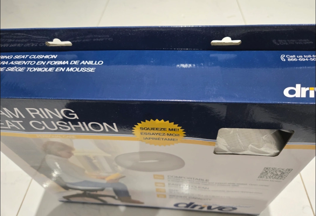 Selling a brand new Drive Foam Ring Seat Cushion still in its original packaging! This cushion is designed for comfort and support while seated. It's easy to clean with its wipeable, backed-supported cover. The weight capacity is 250 lb / 113 kg
