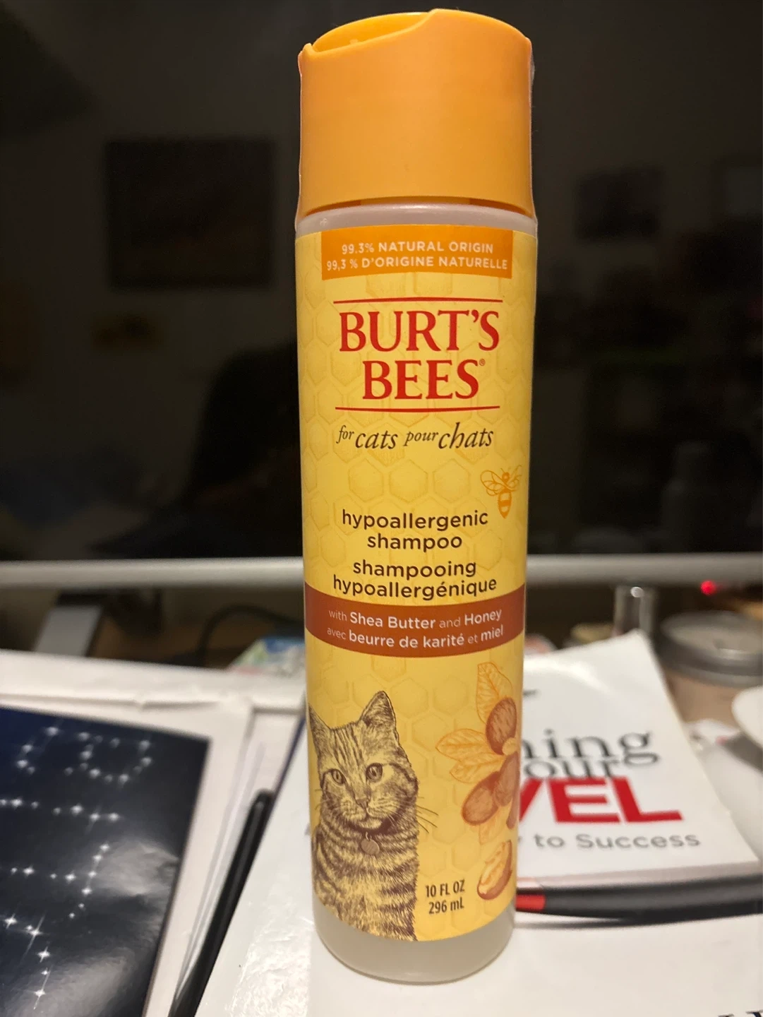 Selling an unused brand new bottle of Burt's Bees Hypoallergenic shampoo for cats! It's made with Shea Butter and Honey to keep your kitty's coat soft and clean. The bottle contains 10 fl oz (296 mL).