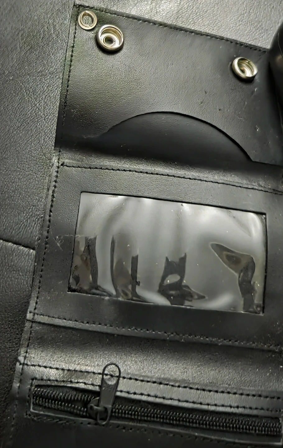 This is a black leather wallet featuring a red skull design on the front. It has a snap closure and a zippered compartment inside. It's in good condition and ready for a new owner!