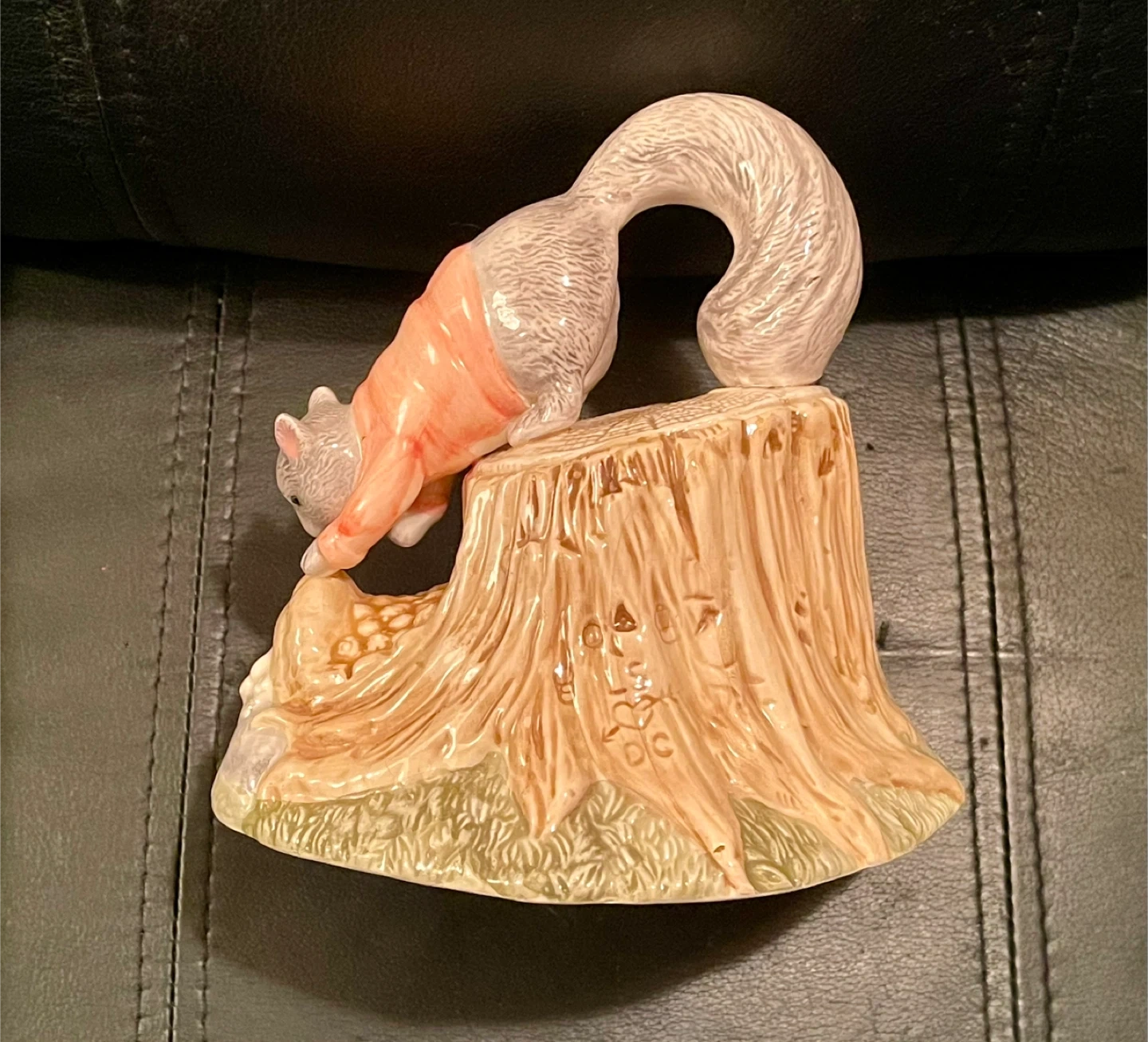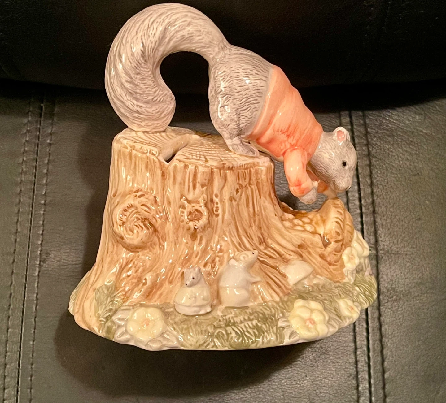 Selling a charming Terragrafics squirrel coin bank! It's a delightful piece with a squirrel perched on a tree stump, surrounded by little mice and flowers. The bottom has the Terragrafics logo and a 1975 sticker. It would make a lovely addition to any collection or a sweet decorative piece for your home. No imperfections that I can see. Looks new.