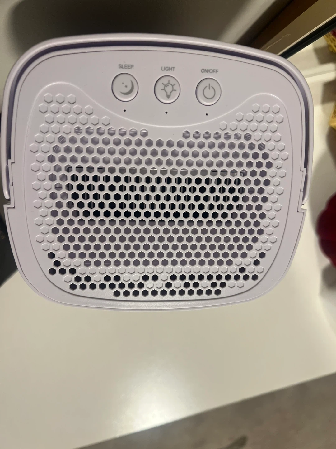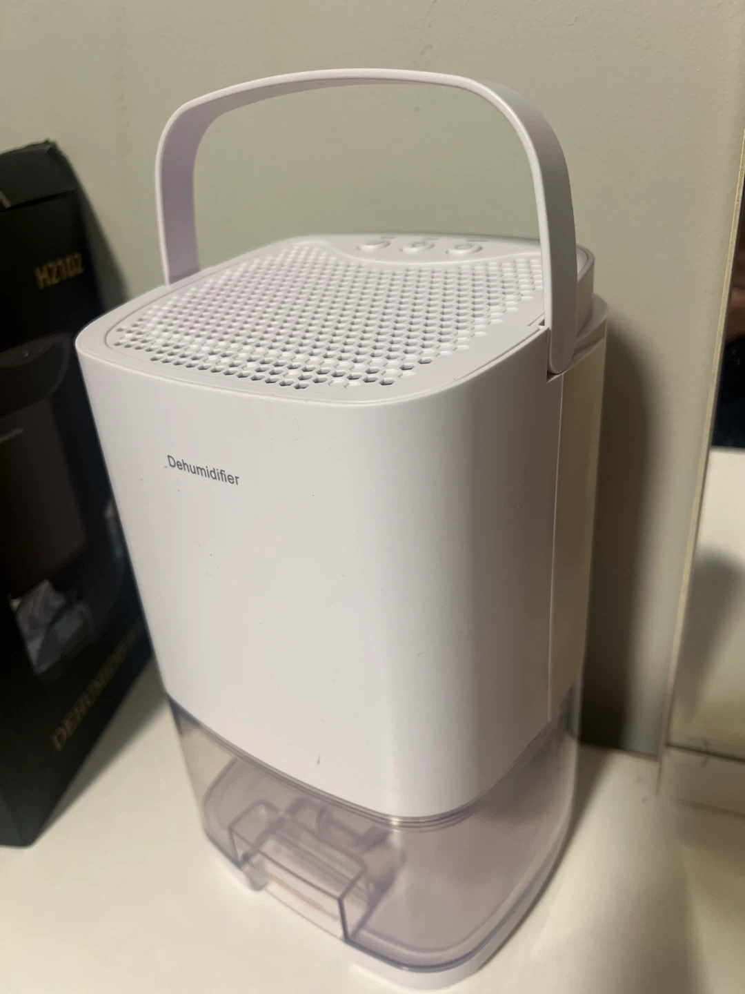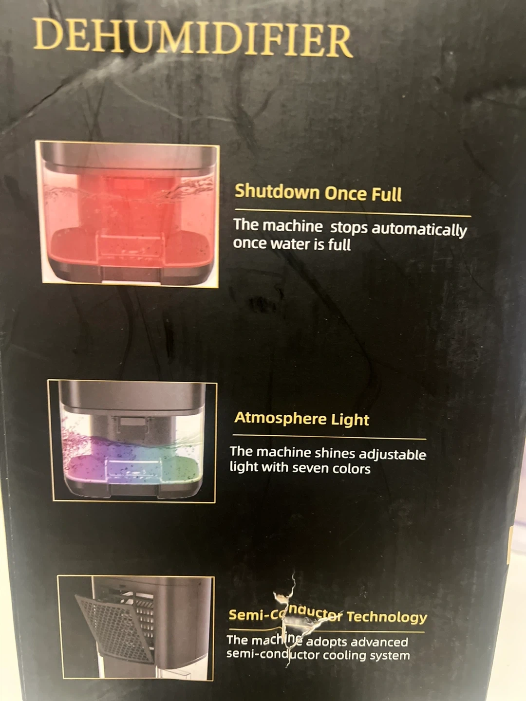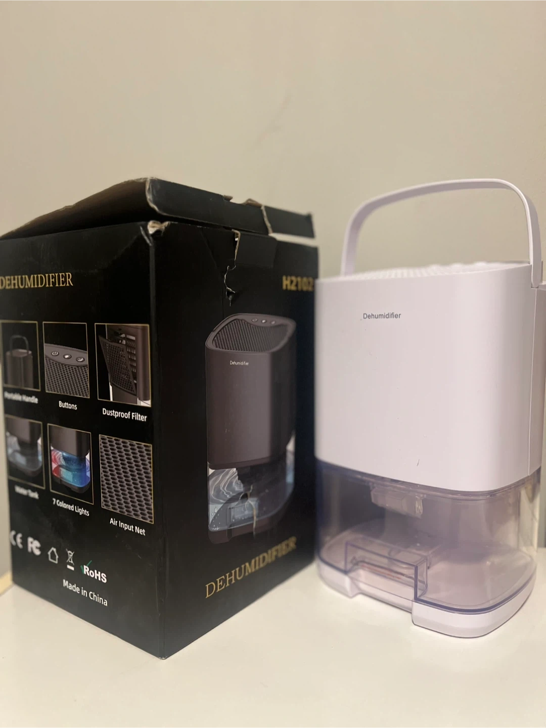 This dehumidifier features a portable handle, buttons, and a dustproof filter. It also has a water tank and 7 coloured lights for a bit of atmosphere! The air input net helps keep things clean, and the machine will automatically shut down once full