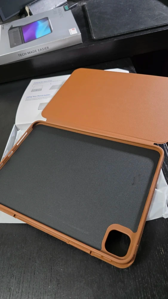 I'm selling a brand new ESR iPad Pro 11 inch case. It's compatible with the M4 2024 (5th Generation) iPad Pro. It's a rotating case with a removable magnetic cover. It can be adjusted for portrait and landscape views and has raised screen edges. The colour is brown and the box is included