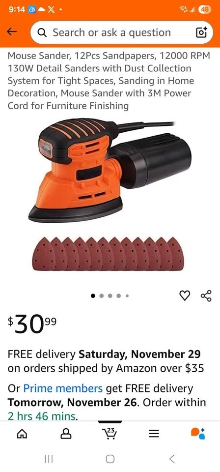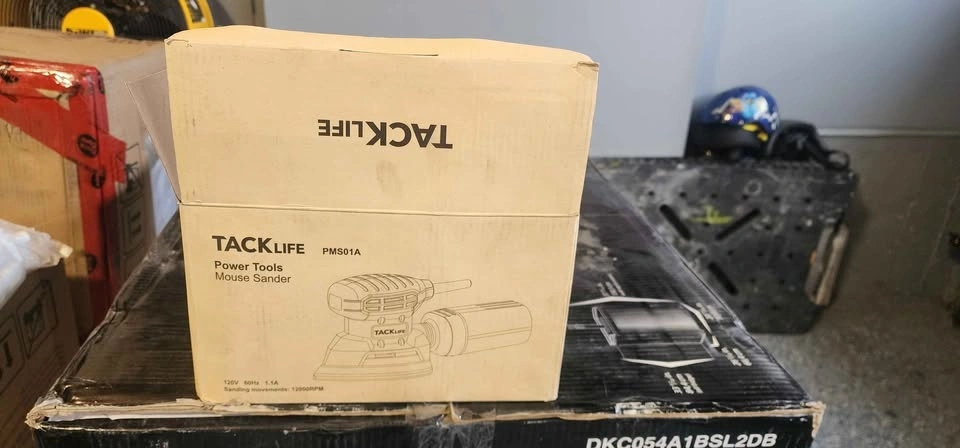 I'm selling a new OPEN BOX Tacklife mouse/corner sander, model PMS01A, perfect for detailed sanding work in tight spaces. This sander features a 130W motor and a 12,000 RPM sanding speed, ensuring efficient material removal and a smooth finish. It comes with a dust collection system to keep your work area clean, and the compact design allows for easy maneuverability and control. Never used, still in the original packaging.