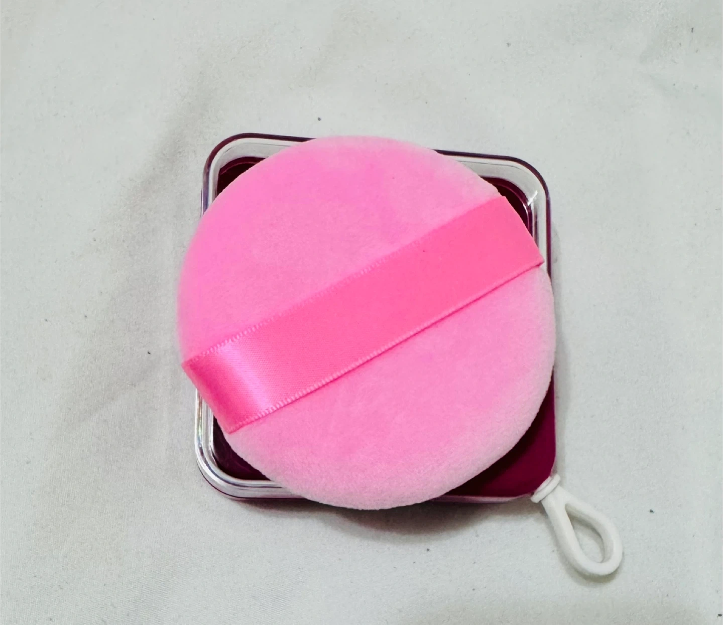 Selling a cute pink makeup powder puff that comes with its own carrying case! It's in great condition and ready to use for applying your favourite powder foundation or blush.