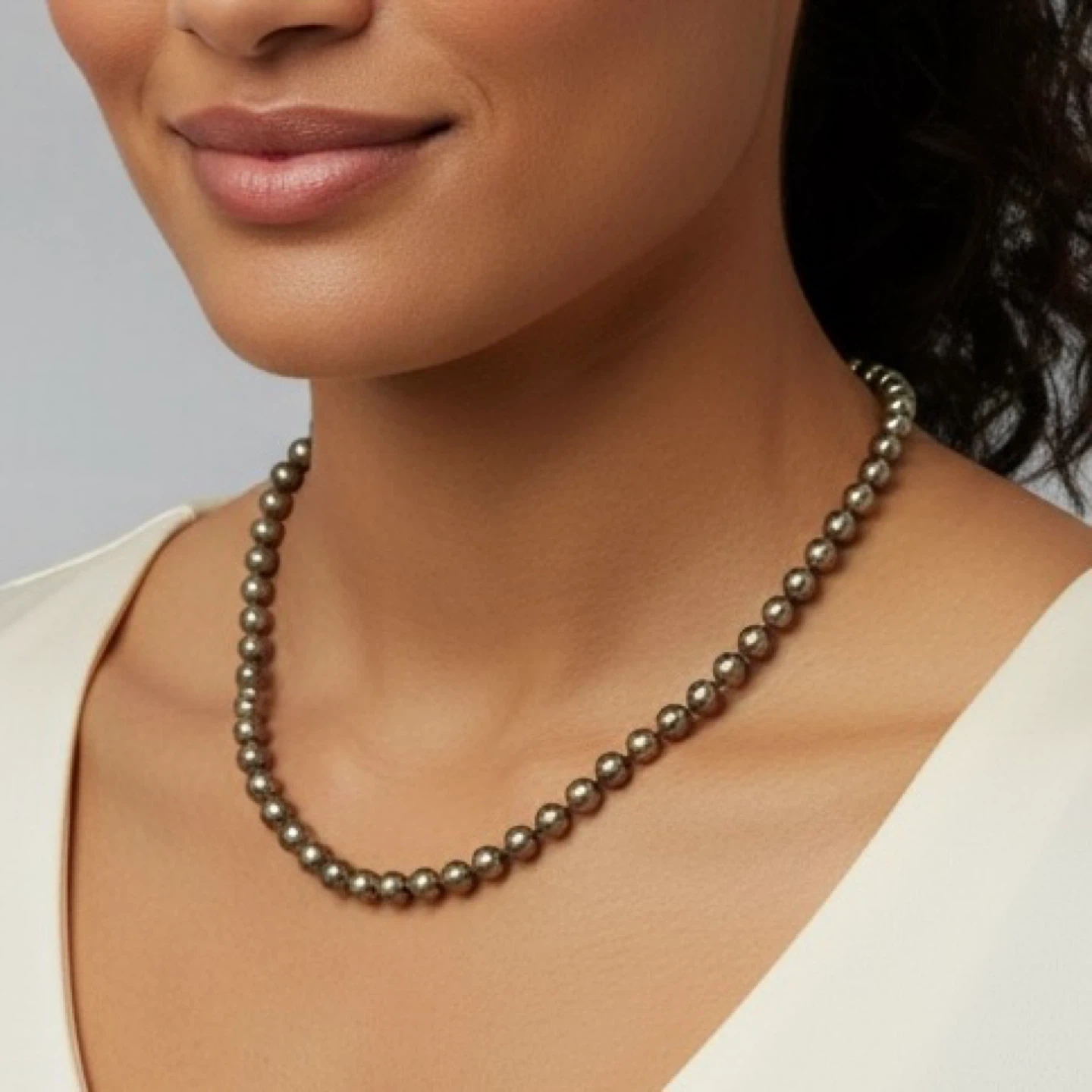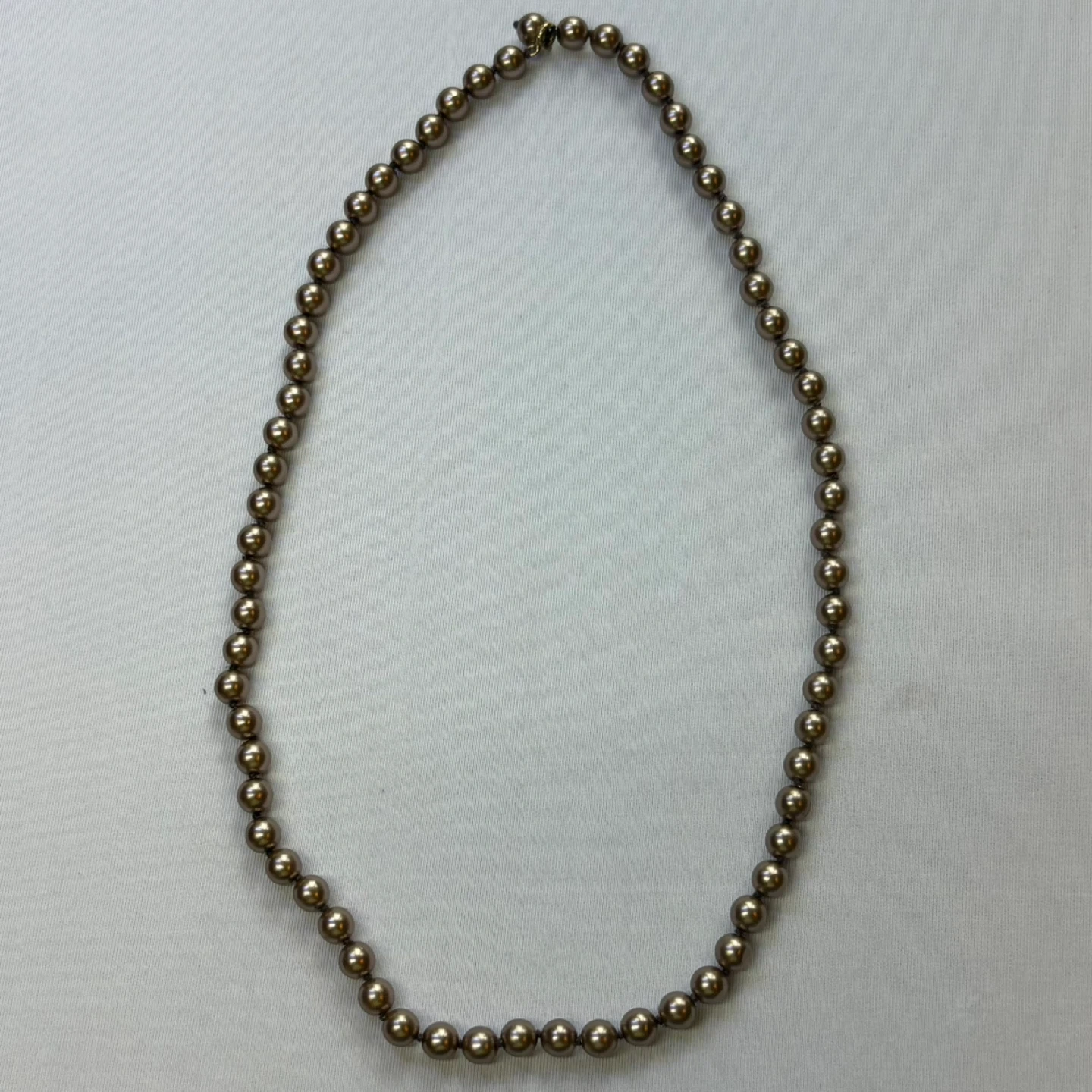 This elegant necklace features a single strand of bronze-colored beads, giving the appearance of rich, metallic pearls. The beads are individually knotted, which adds a classic touch and protects them from rubbing. The timeless design makes it versatile for both formal occasions and everyday wear, adding a touch of sophisticated glamour to any outfit. The length is approximately 22 inches, making it a classic princess length.