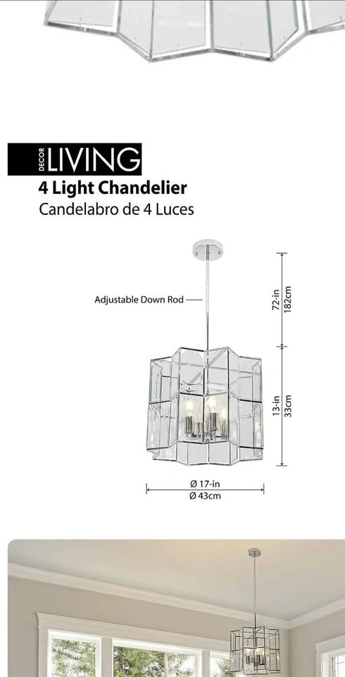 Illuminate your space with this brand new Décor Living 4-Light Chandelier, featuring a polished chrome finish and crystal accent shades. It's designed for 4x 60W Max E26 bulbs, providing ample light and a touch of elegance to any room. This is a brand new chandelier, never used and still in the original packaging. Spruce up your dining room or living space with this gorgeous lighting fixture!