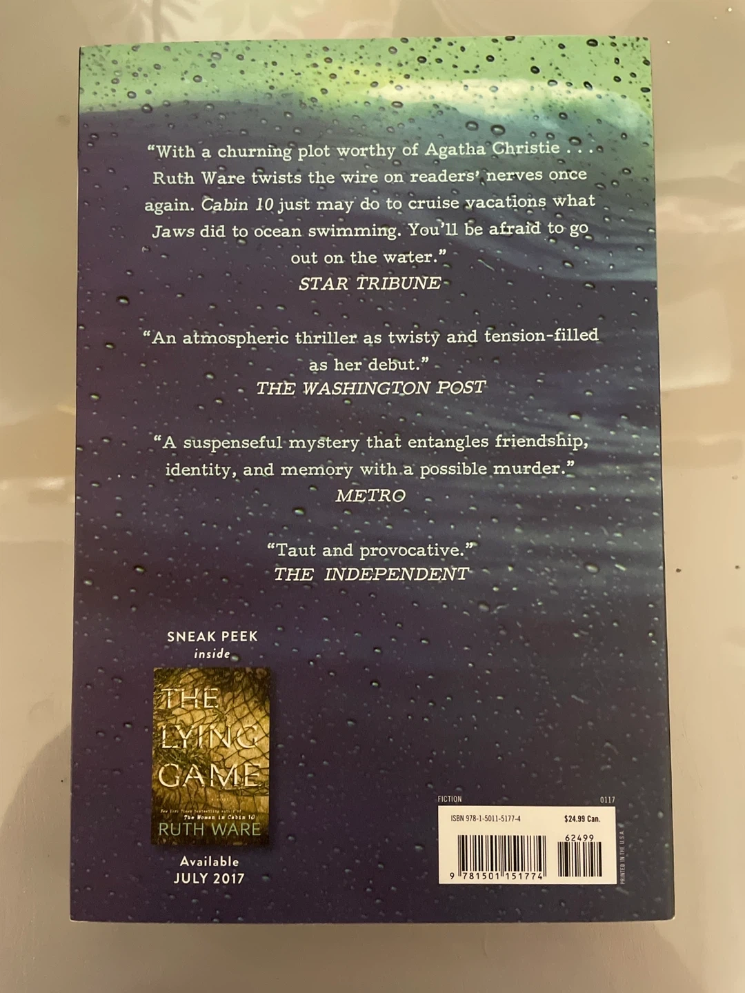 Selling a copy of "The Woman in Cabin 10" by Ruth Ware! It's an internationally bestselling novel and a suspenseful thriller. Perfect for fans of mystery and suspense.