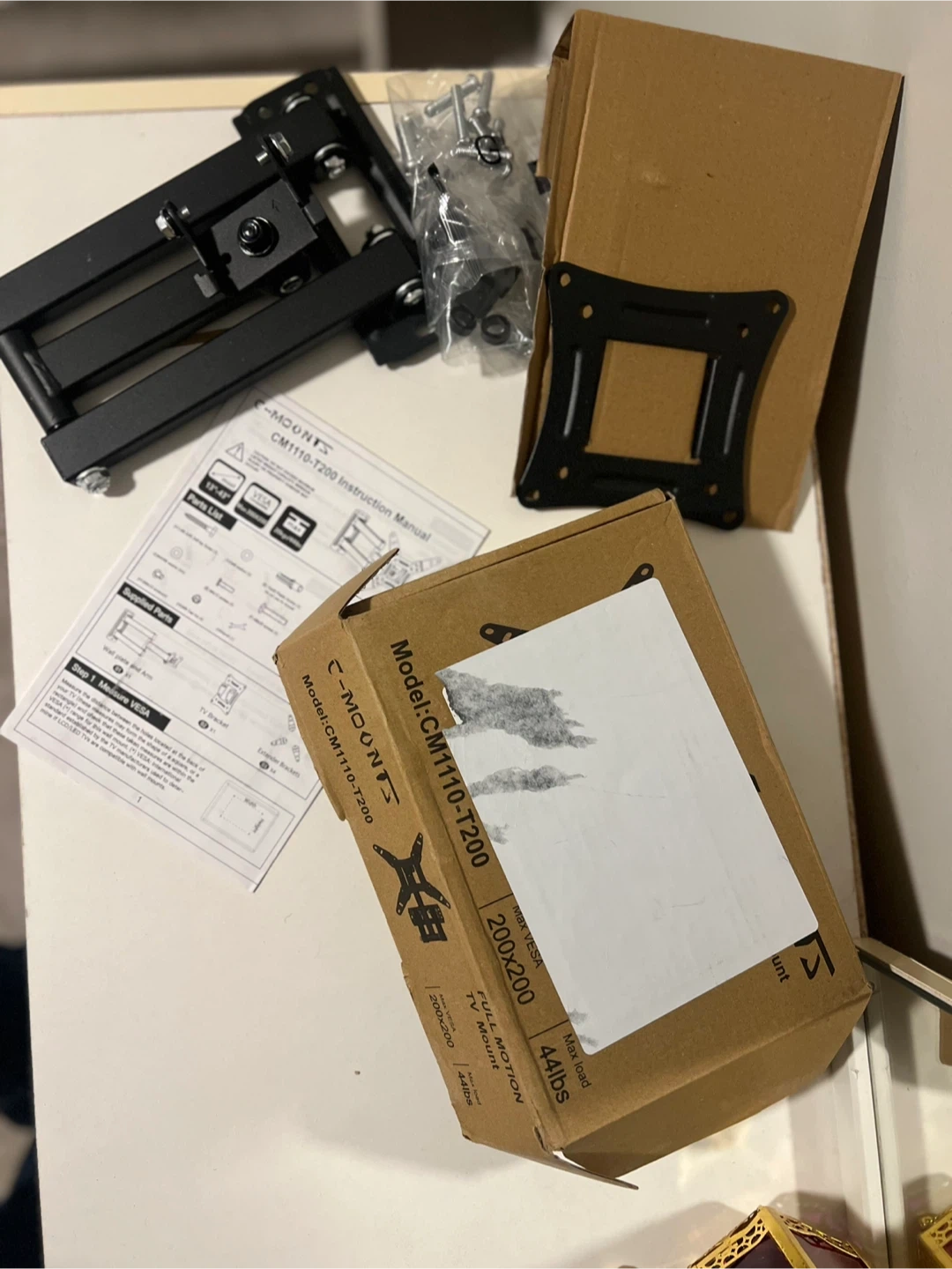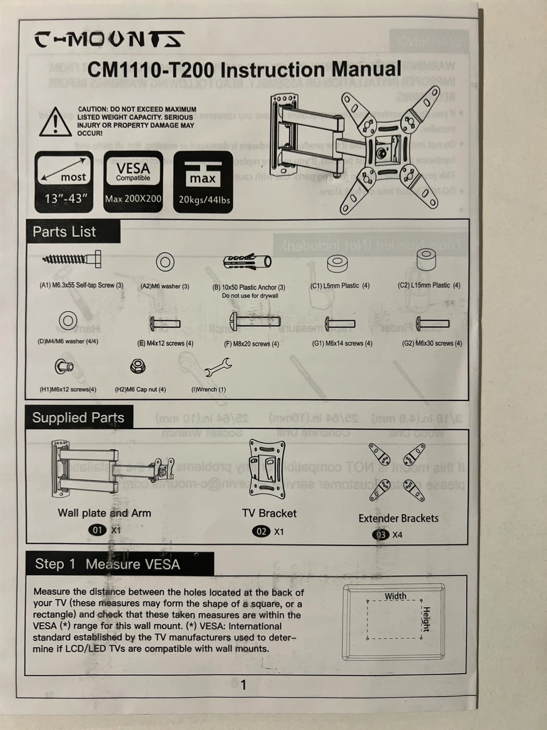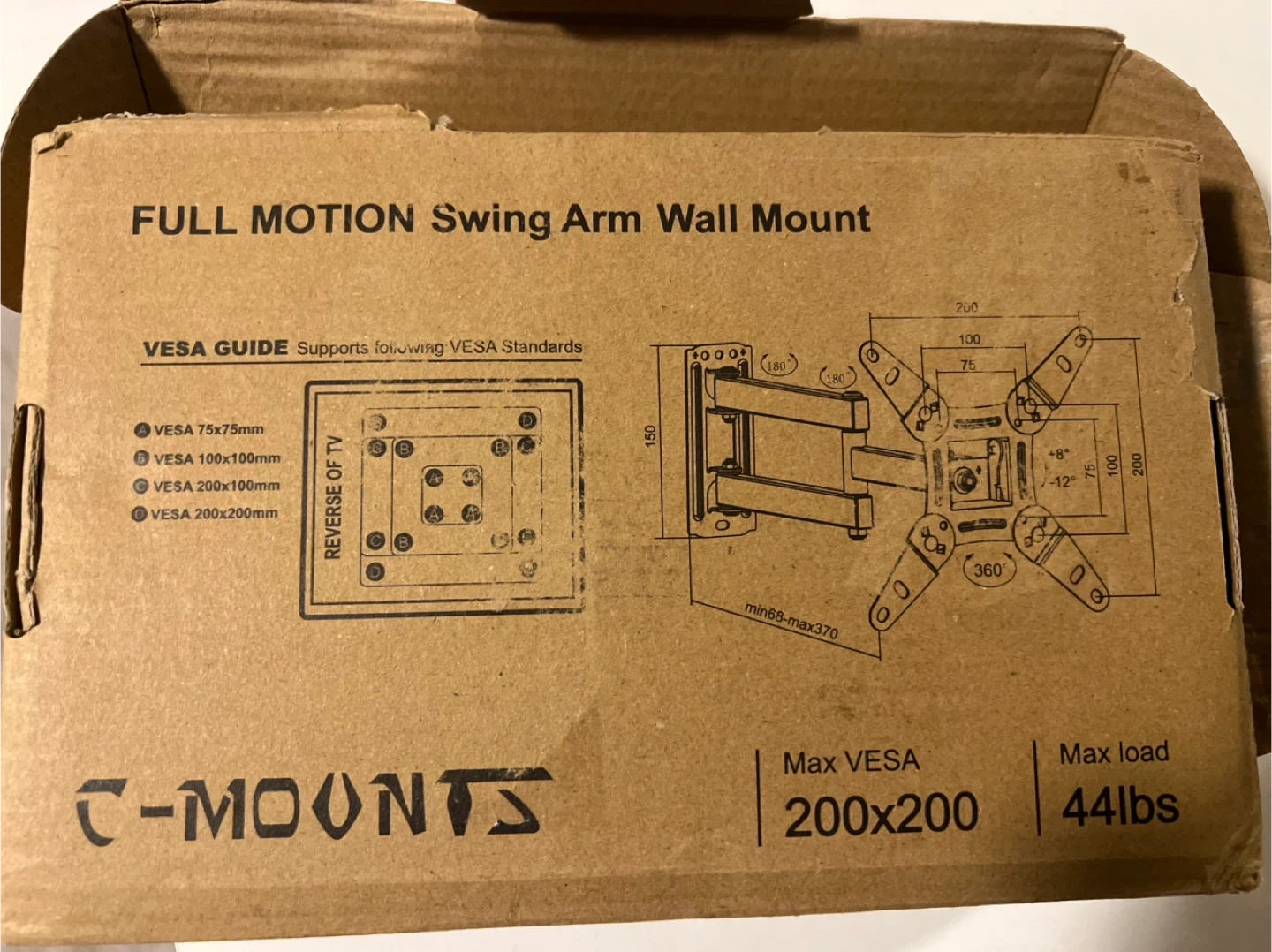 I'm selling a brand new CMounts CM1110-T200 full motion swing arm wall mount! It supports VESA standards 75x75mm, 100x100mm, and 200x200mm. It's designed for TVs ranging from 13"-43" and has a maximum load capacity of 44lbs. All parts are included, along with the instruction manual and the original box
