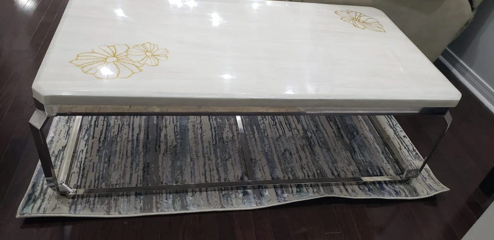 Selling a coffee table with a marble top and a unique floral design. It has a sturdy base and would be a great addition to any living room!
