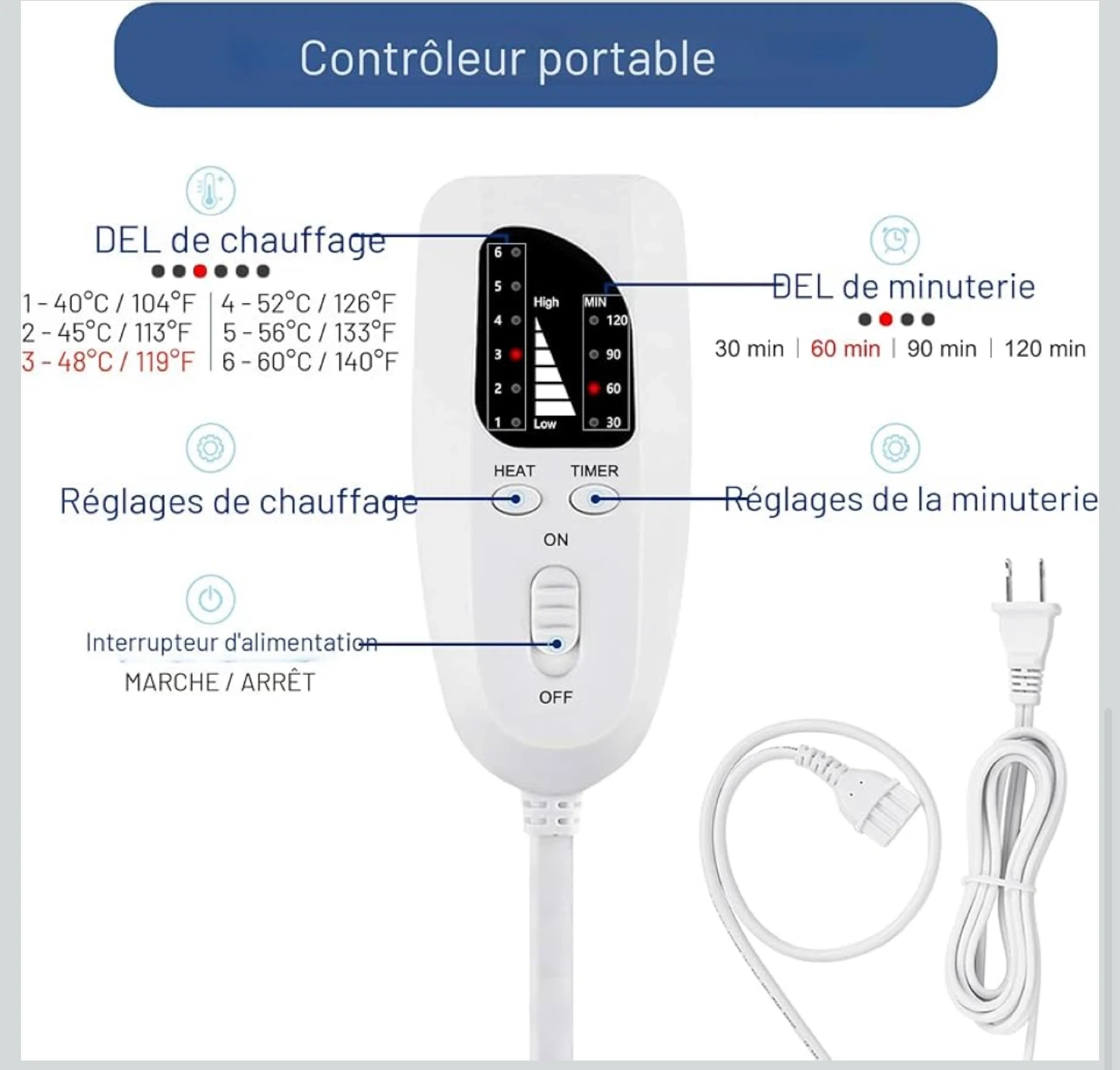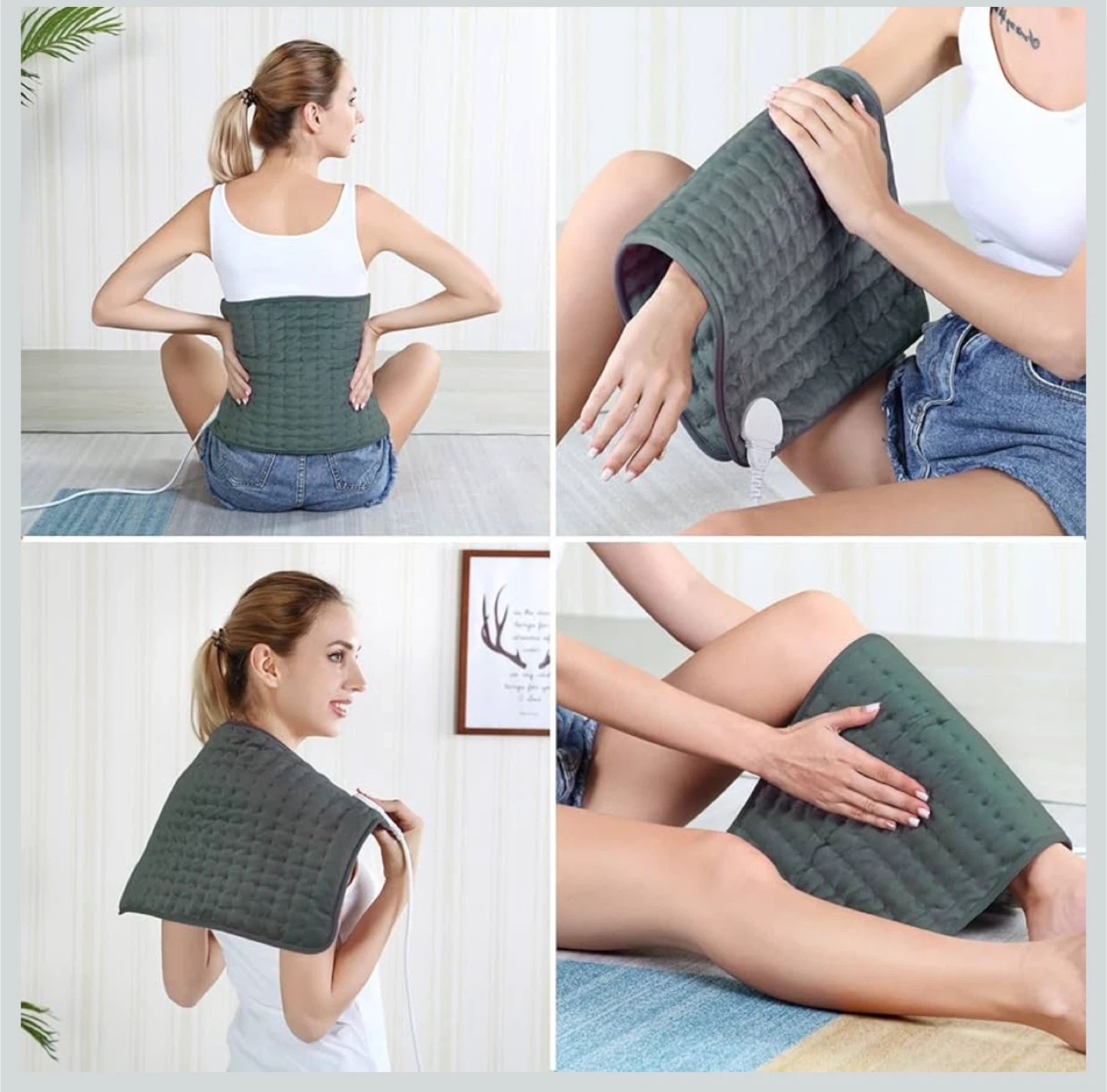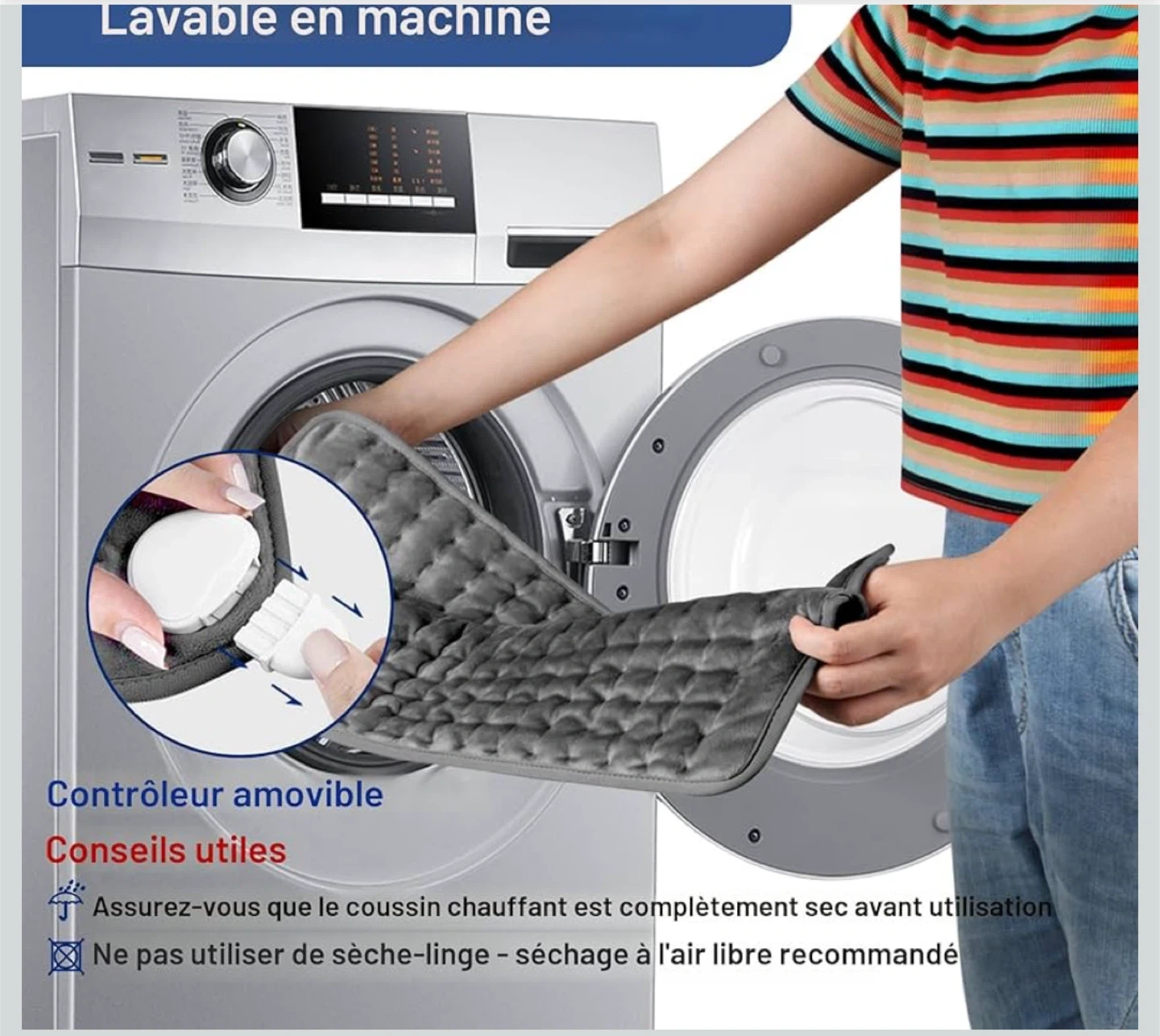 This heating pad comes with a portable controller for easy use. It features multiple heat settings, ranging from 40°C to 60°C, and timer settings from 30 to 120 minutes. It's also machine washable for easy cleaning!