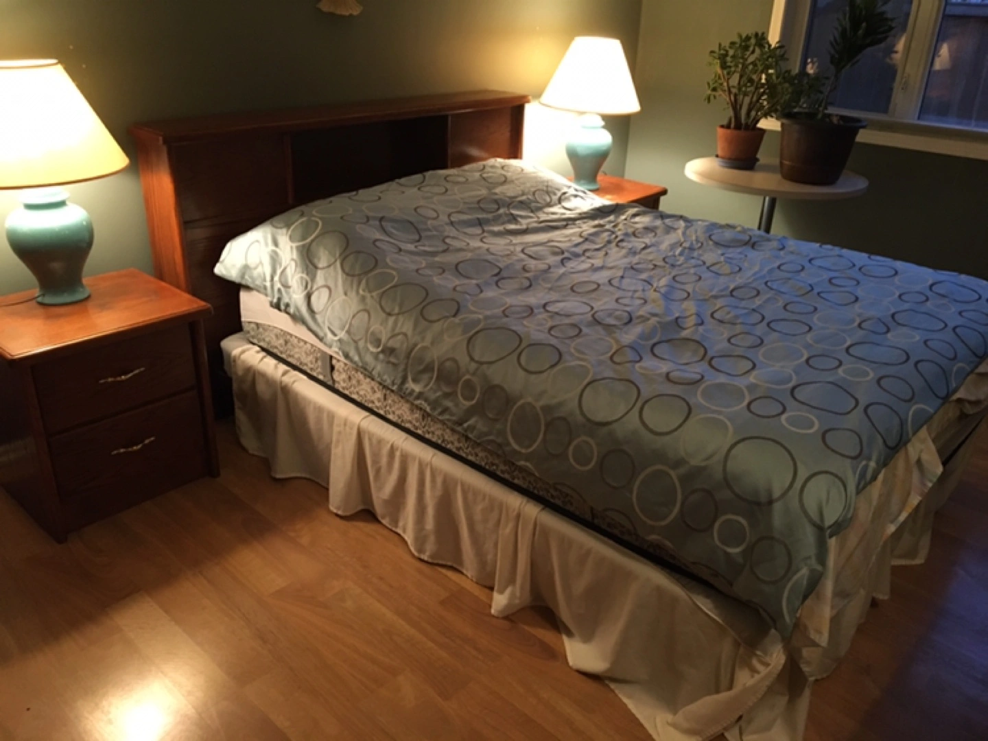This gently used bedroom set includes a queen-sized headboard with attached shelving, a queen mattress, two nightstands with lamps, a long dresser with a triple mirror, and a tall dresser. It’s perfect for someone looking to fill a room with a complete, matching set.
