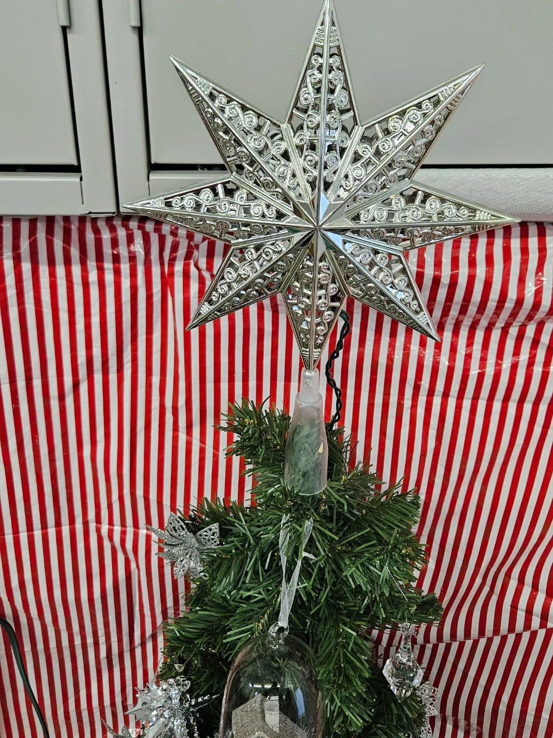 Selling a small Christmas tree decorated with silver ornaments. It's perfect for adding a festive touch to any room during the holiday season! The tree is in great condition and comes with a variety of silver ornaments, including stars and snowflakes. Used to open eyes. Still sings on a motion sensor.