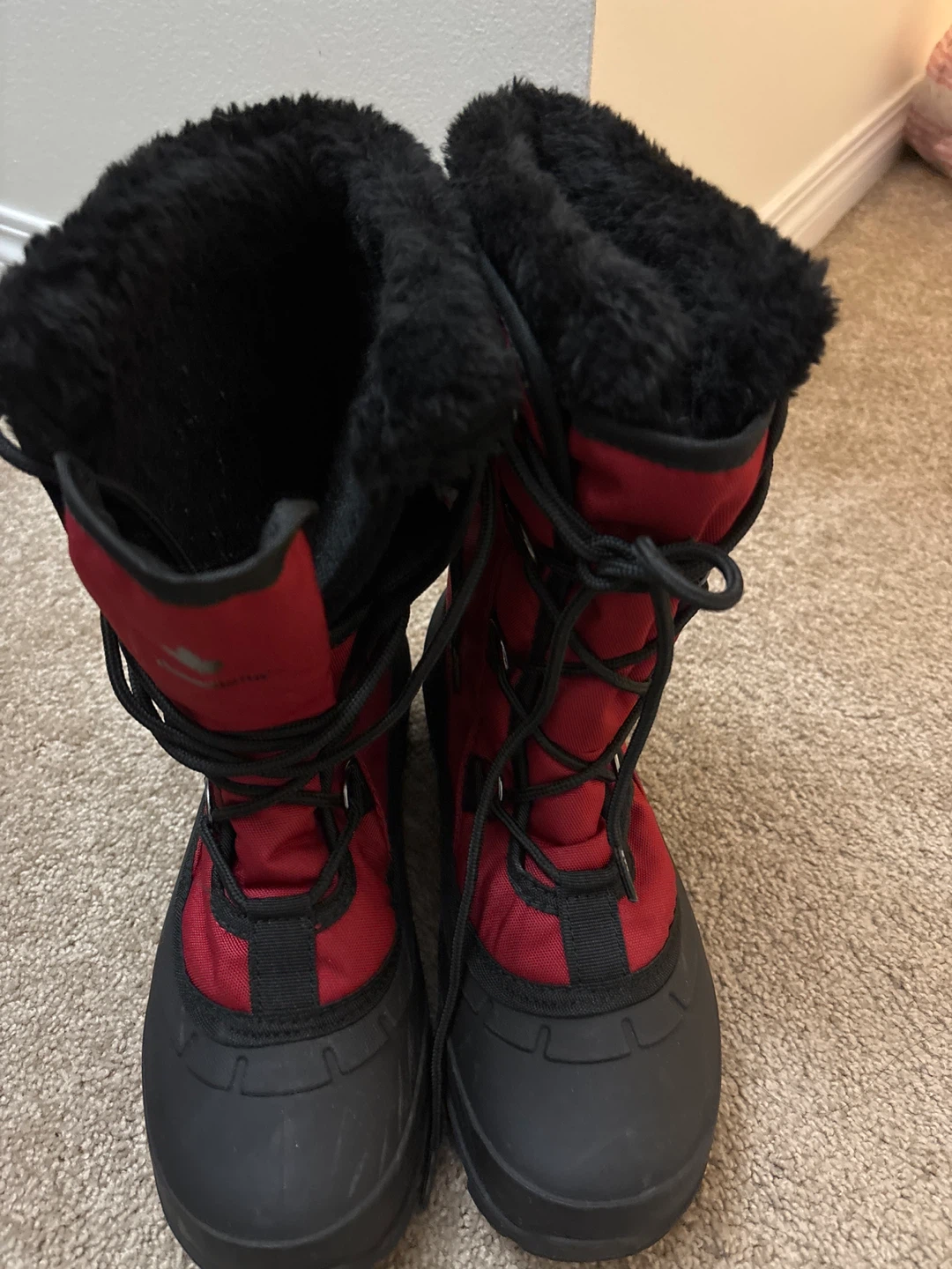 Keep your feet warm this winter with these Trek Mountain winter boots! They're red and black with a faux fur lining, perfect for snowy days