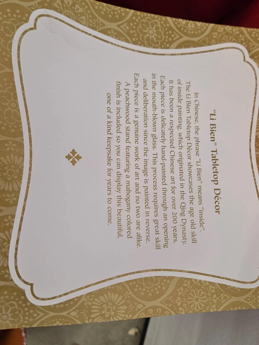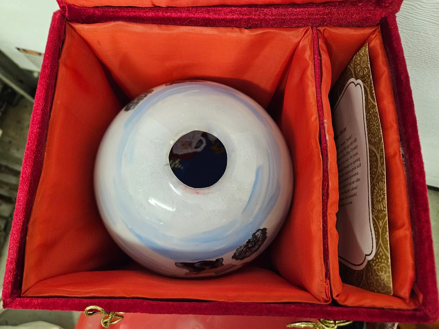 Selling a beautiful Li Bien Tabletop Décor piece. It showcases the age-old skill of inside painting, which originated in the Qing Dynasty. Each piece is delicately hand-painted through an opening in the mouth-blown glass. The piece comes in its original red box, which is lined with polyurethane foam. It's a genuine work of art and no two are alike!
