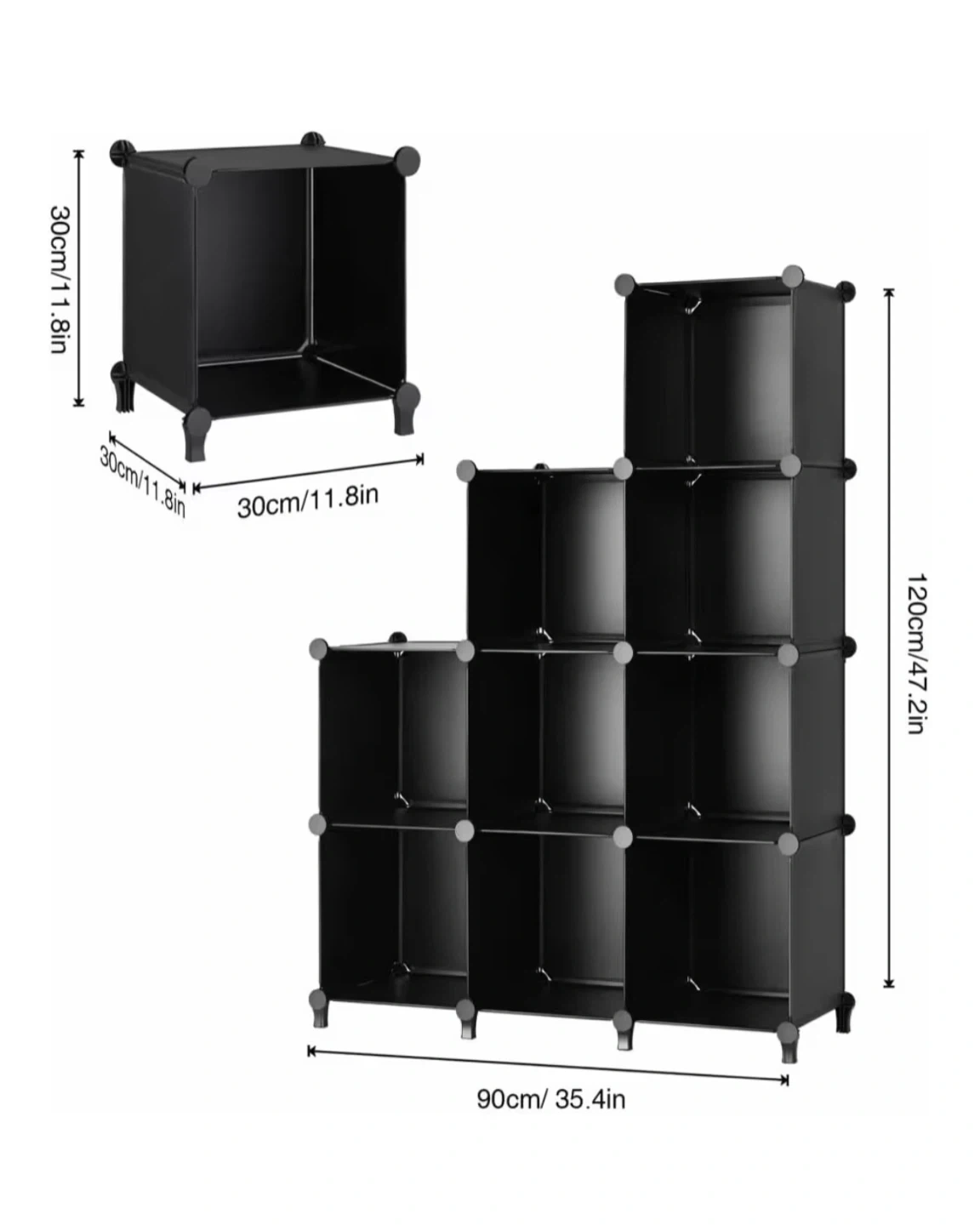 These black modular cube storage shelves are perfect for organizing any space! Each cube measures approximately 30cm x 30cm (11.8 inches), and you can arrange them in various configurations to suit your needs. Easy to assemble and disassemble!