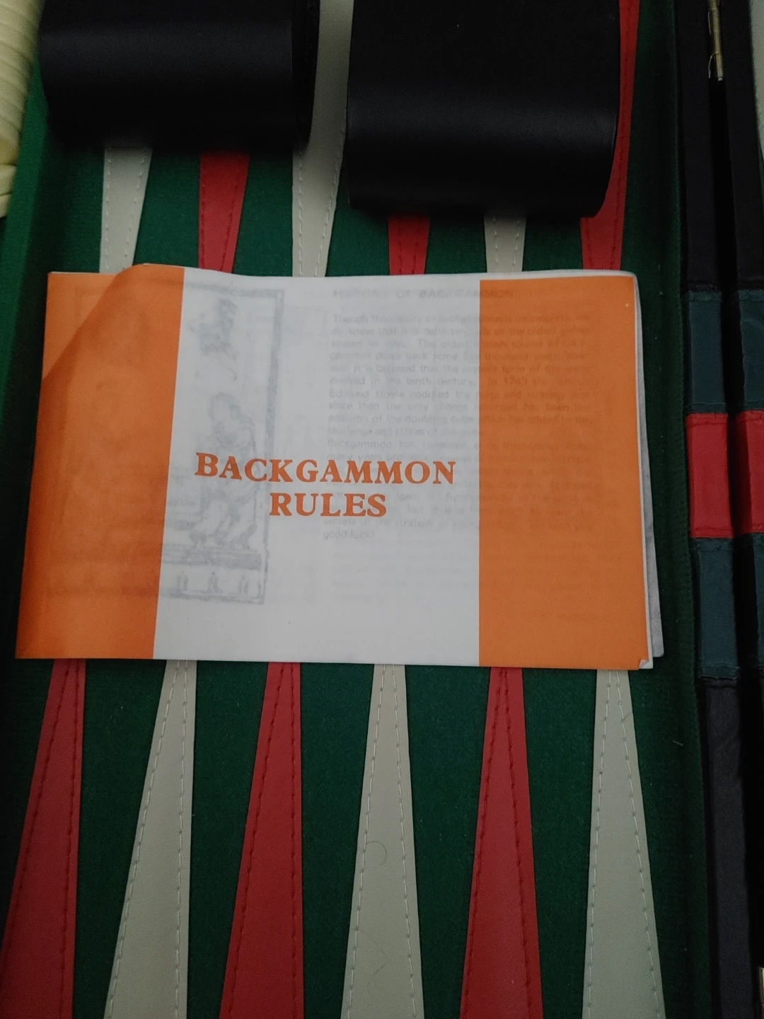 Selling a complete backgammon set! It comes with all the pieces you need to play, including the dice, checkers, and doubling cube. The set also includes the backgammon rules. Perfect for a fun game night with friends or family
