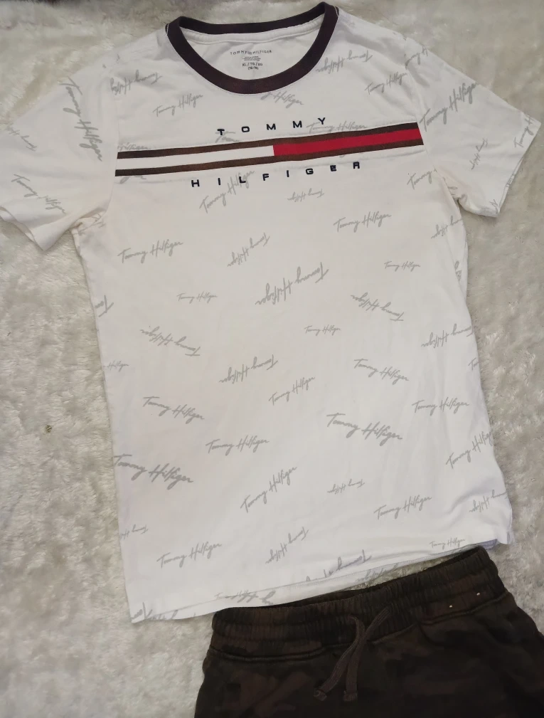 Tommy Hilfiger T-shirt, size XL. It's white with the brand name printed all over, and the classic Tommy Hilfiger stripe across the chest. Perfect for casual wear! π