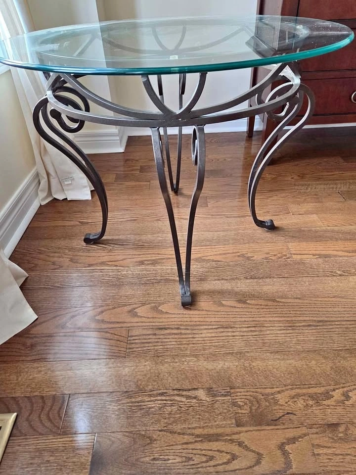 Heavy genuine solid wrought iron (not tubular) side table, 30" glass top with beveled edge. Dark bronze textured finish. Feltac pads on the feet. Suitable for a living room. *Matching rectangular hall table is available in a separate ad.