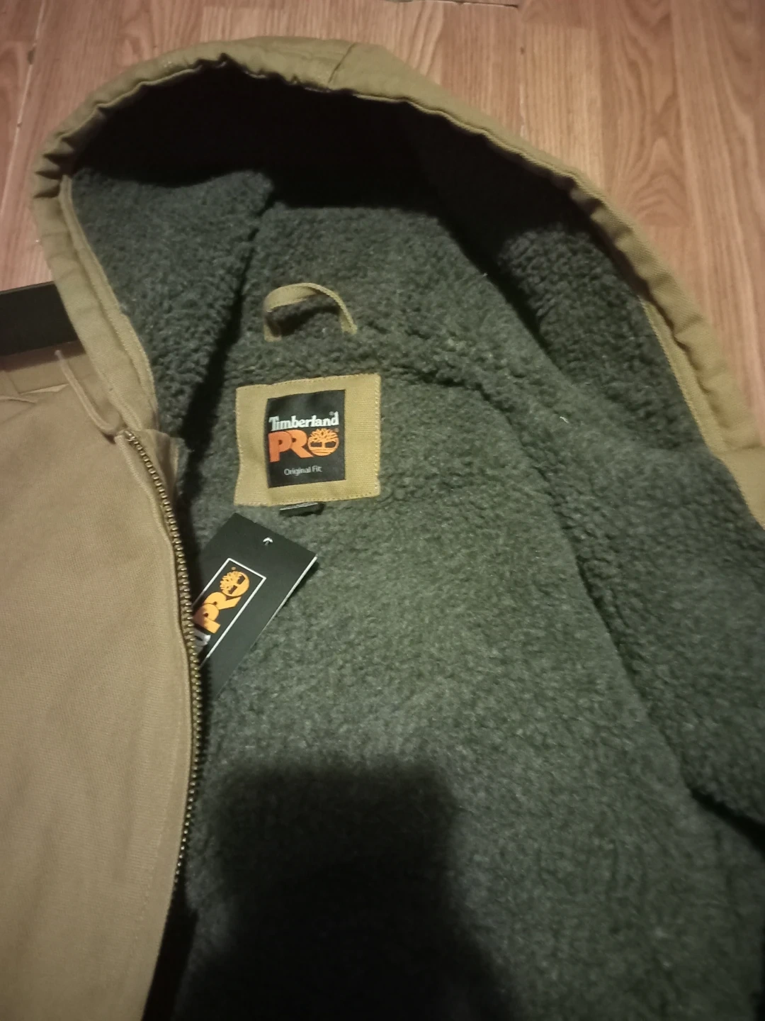 Selling a Timberland Pro hooded jacket in great condition! It's an original fit and features a cozy, sherpa-like lining. Perfect for staying warm during those chilly days!