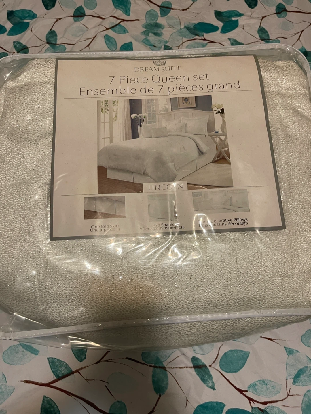 Selling a brand new Dream Suite 7-piece queen bed set, still in its original packaging! The set includes one bed skirt, two shams, and three decorative pillows. It's a beautiful set to add a touch of elegance to your bedroom