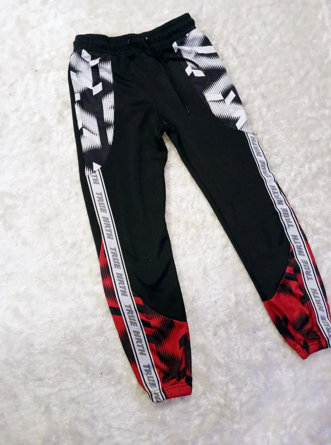 Selling a pair of True Noth joggers in black and red. They're in great shape and ready for a new owner! The design features a unique pattern with the words 'TRUE NRTH' along the sides.