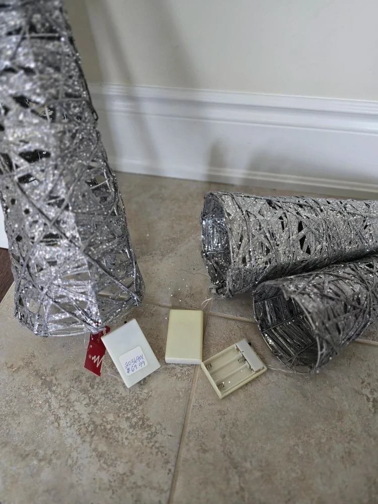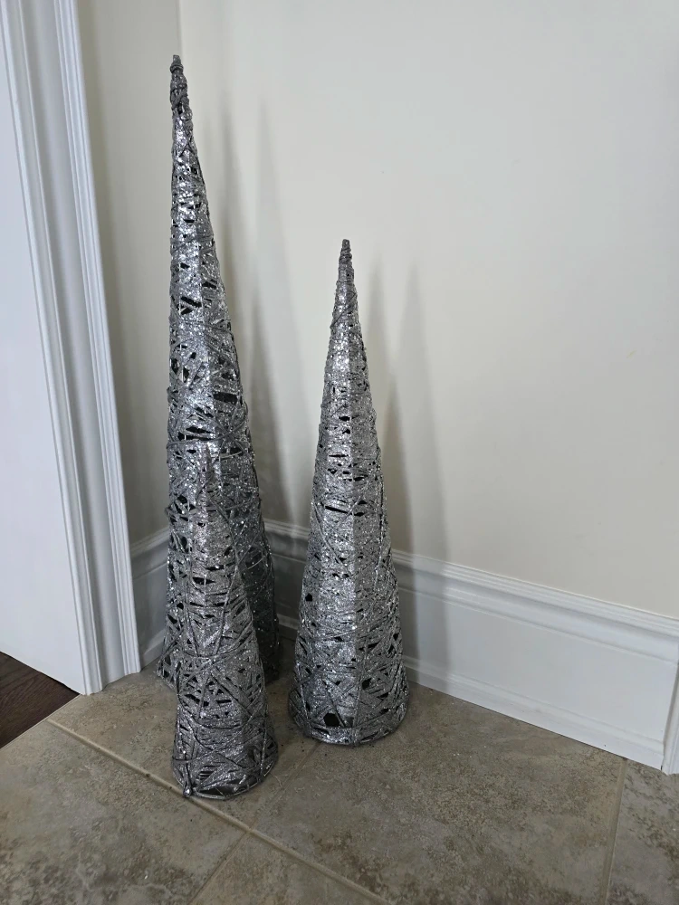 Here's a set of three silver decorative cones, perfect for adding a festive touch to your home this holiday season! They vary in size, adding visual interest to any display. They're in great condition and ready to bring some sparkle to your decor