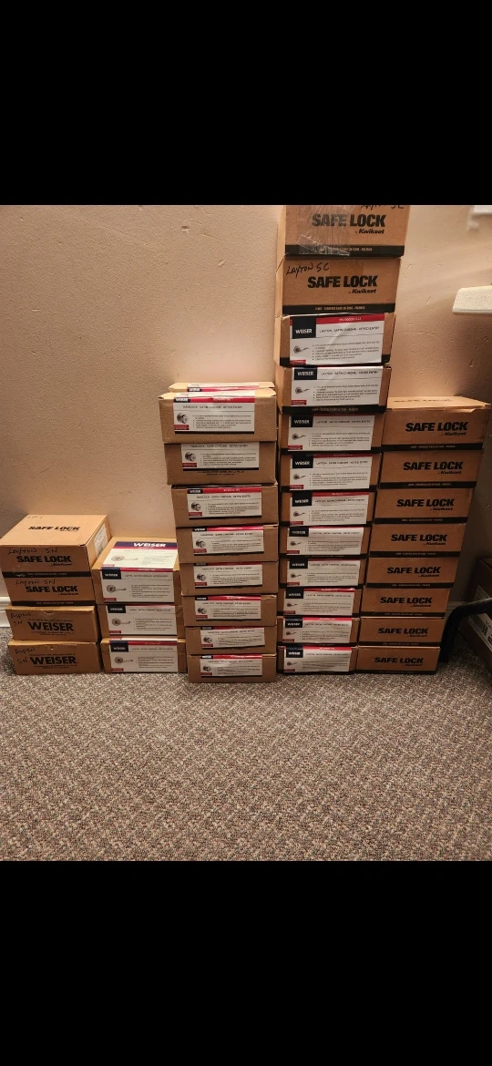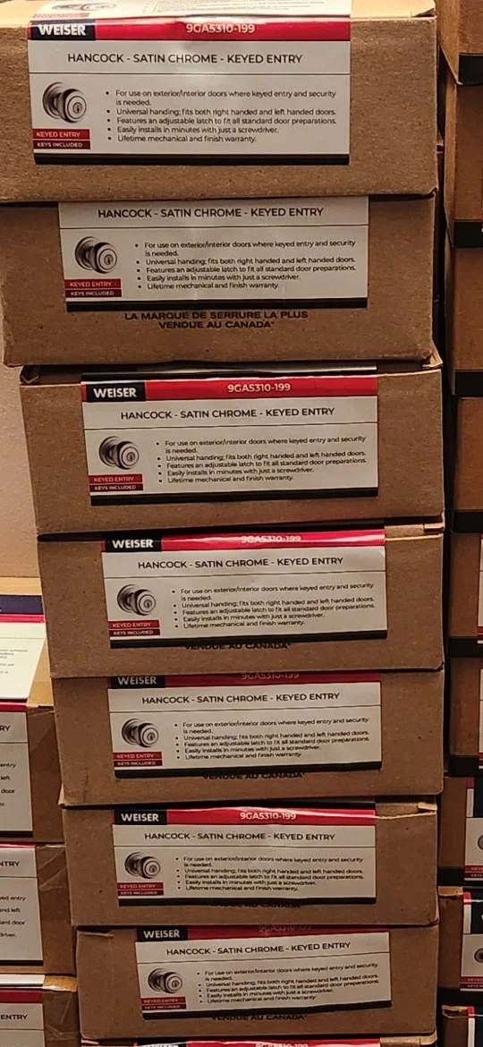 Selling Weiser Hancock and Layton satin chrome keyed entry doorknobs & Handles Assorted Colours, No Black These are for use on exterior/interior doors where keyed entry and security is needed. They feature an adjustable latch to fit all standard door preparations and easily install in minutes with just a screwdriver. They also come with a lifetime mechanical and finish warranty!