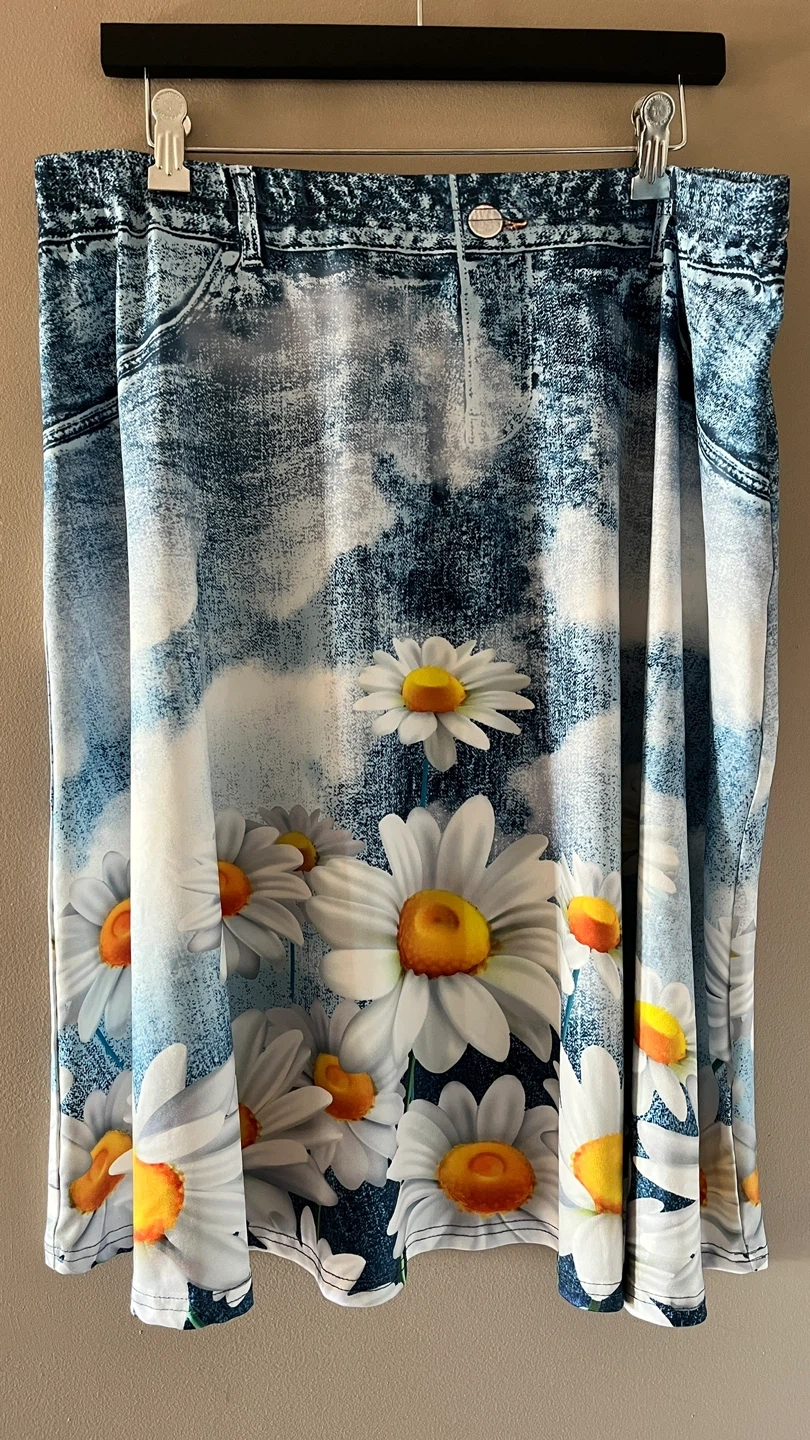 Selling a Rosegal skirt in size 2X! It features a unique denim print with a lovely daisy design. Great for adding a fun and floral touch to your wardrobe