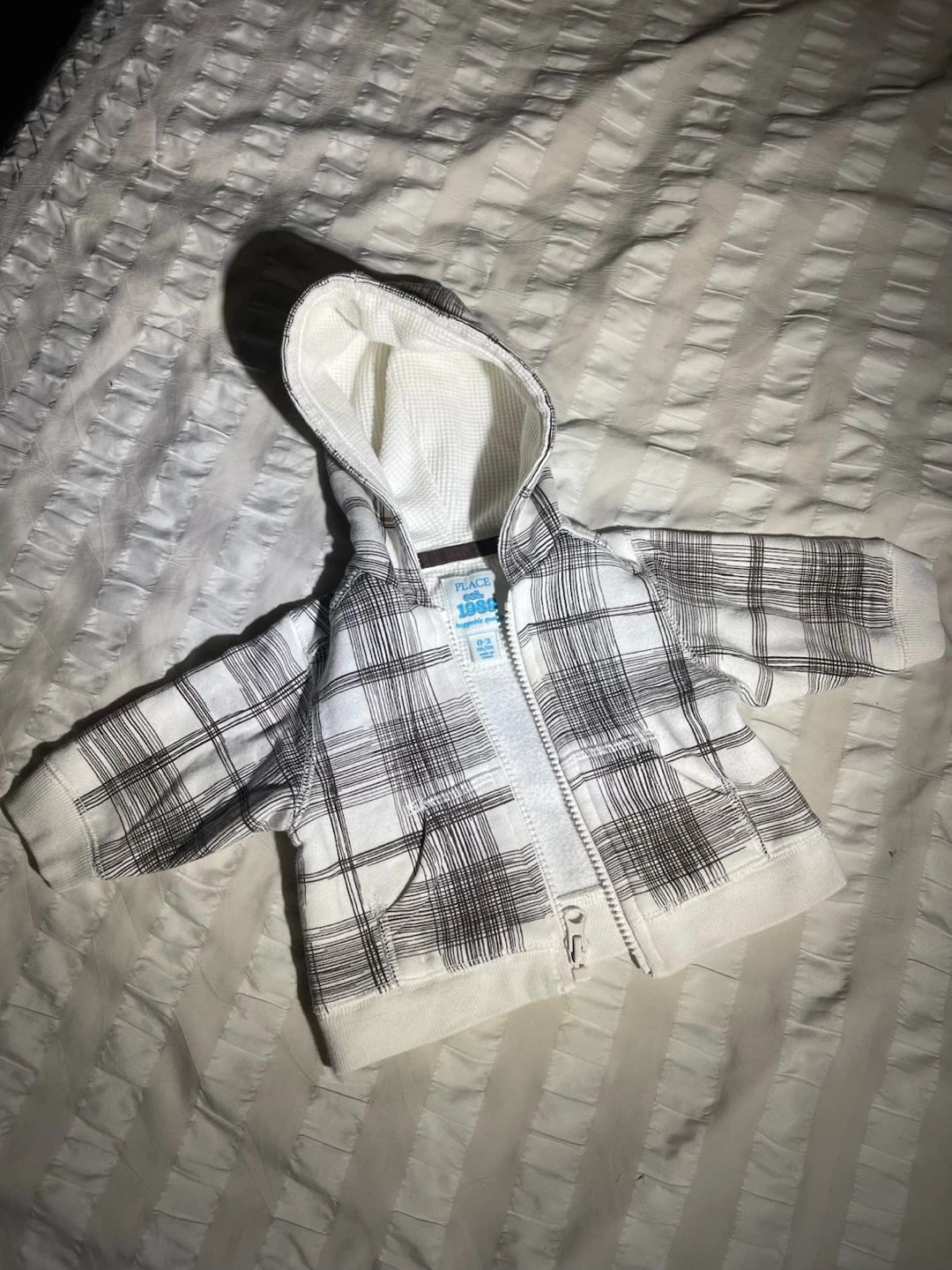 A cute zip-up hoodie from The Children's Place! It features a plaid pattern and is sized for 0-3 months. This hoodie is in great condition and ready for a new little one to wear