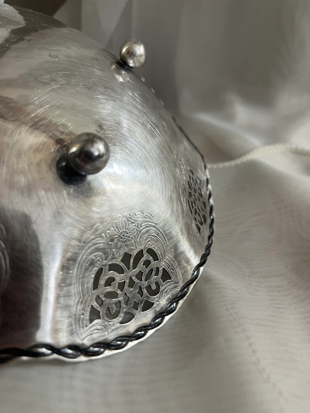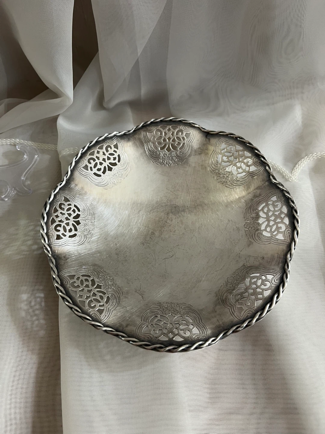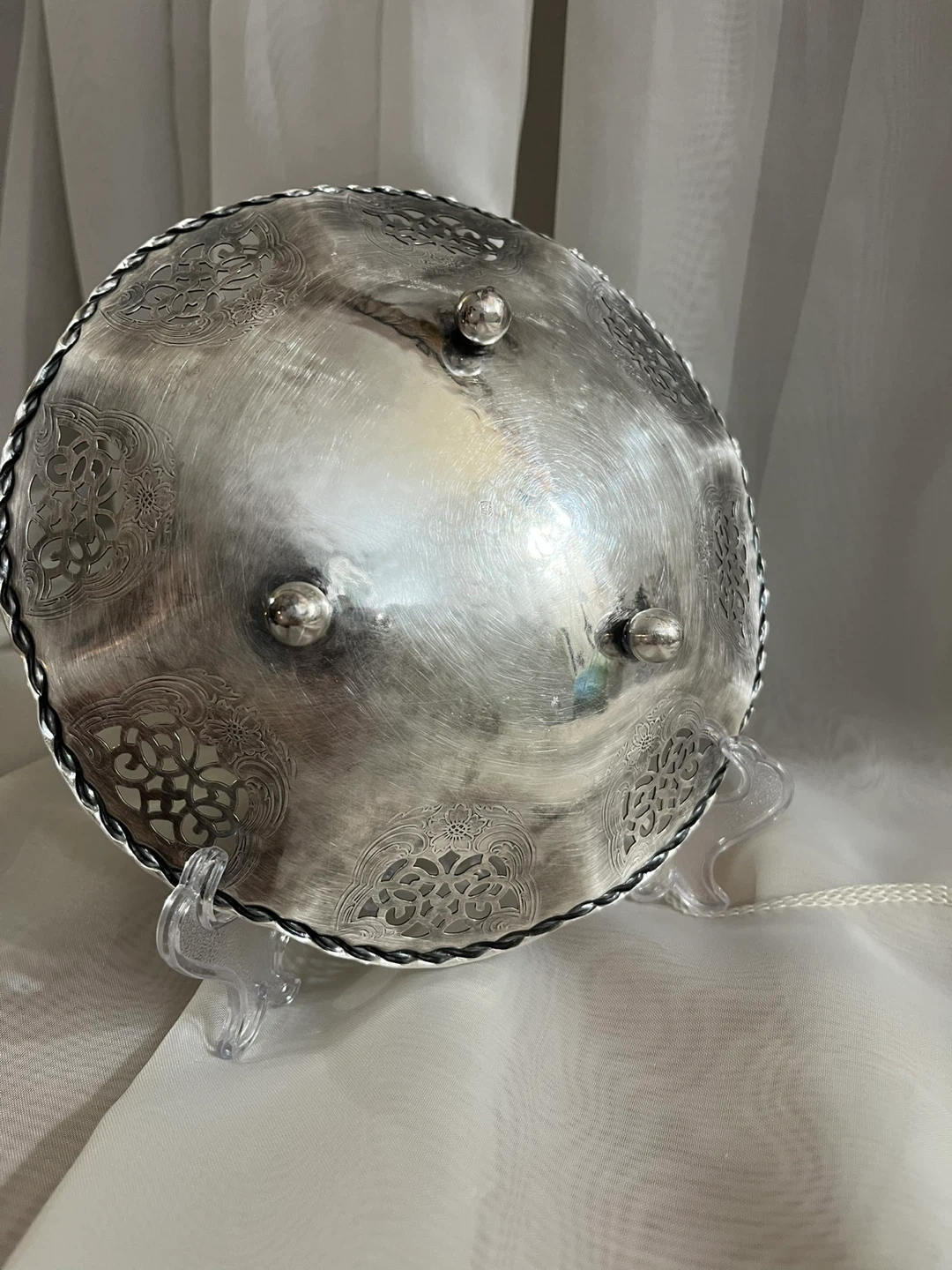 Here's a lovely silver plated bowl with decorative detailing around the edge! It's approximately 6 inches in diameter and has three small feet on the bottom. It's in good condition and would make a nice addition to any table