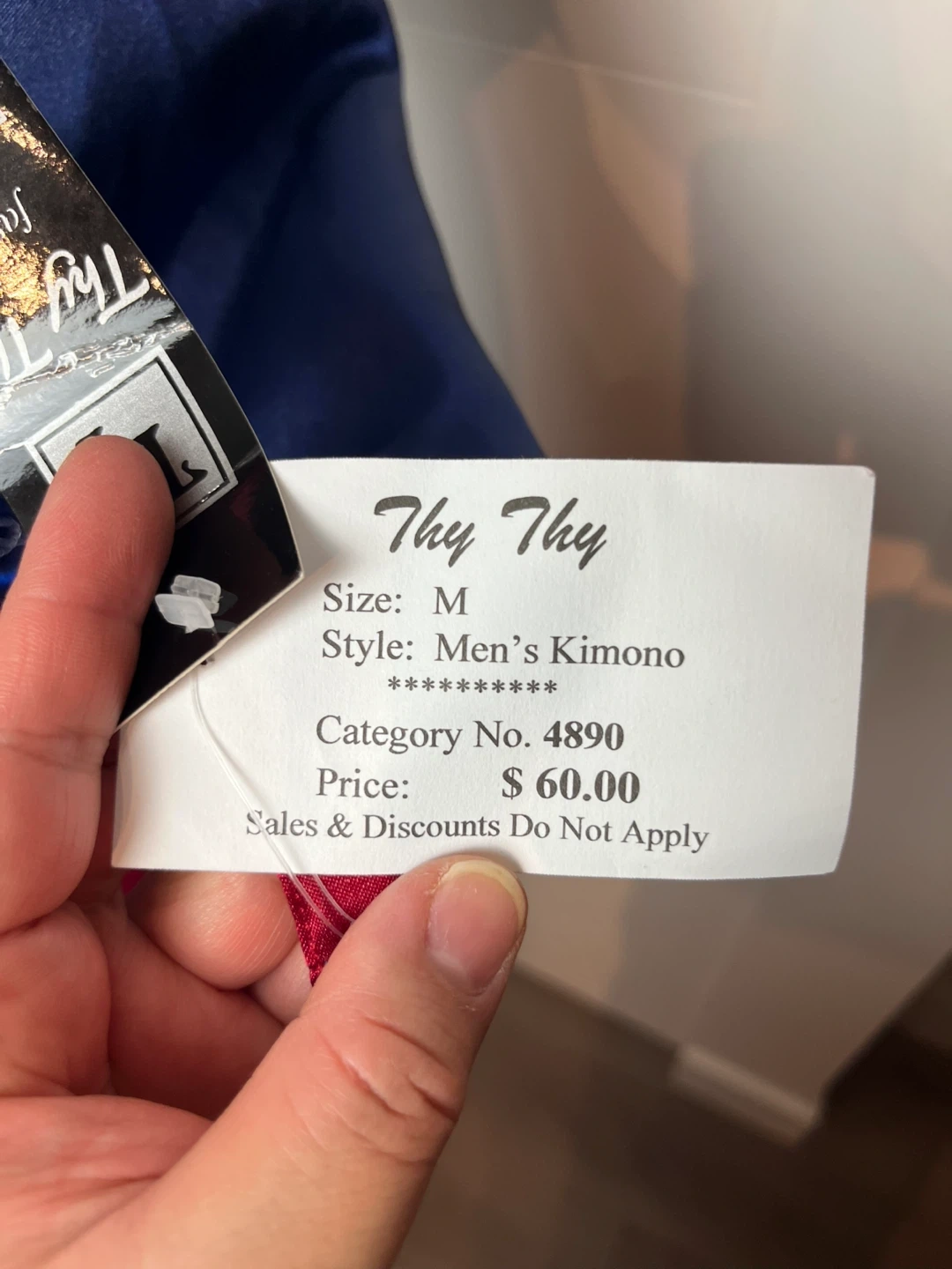 Selling a Thy Thy men's kimono in size medium! It's a beautiful navy blue with red accents and intricate dragon embroidery. The tag shows it originally retailed for $60.