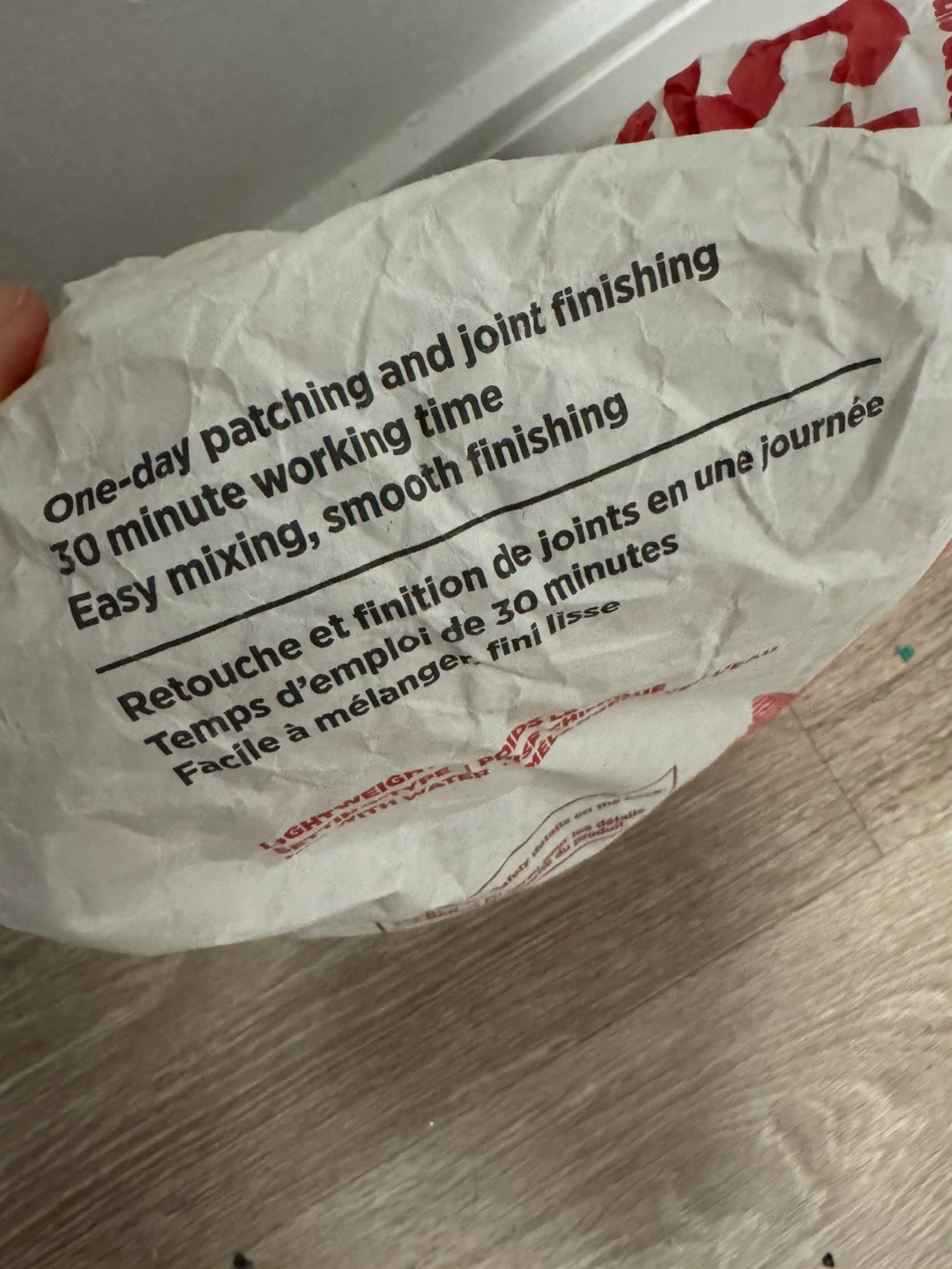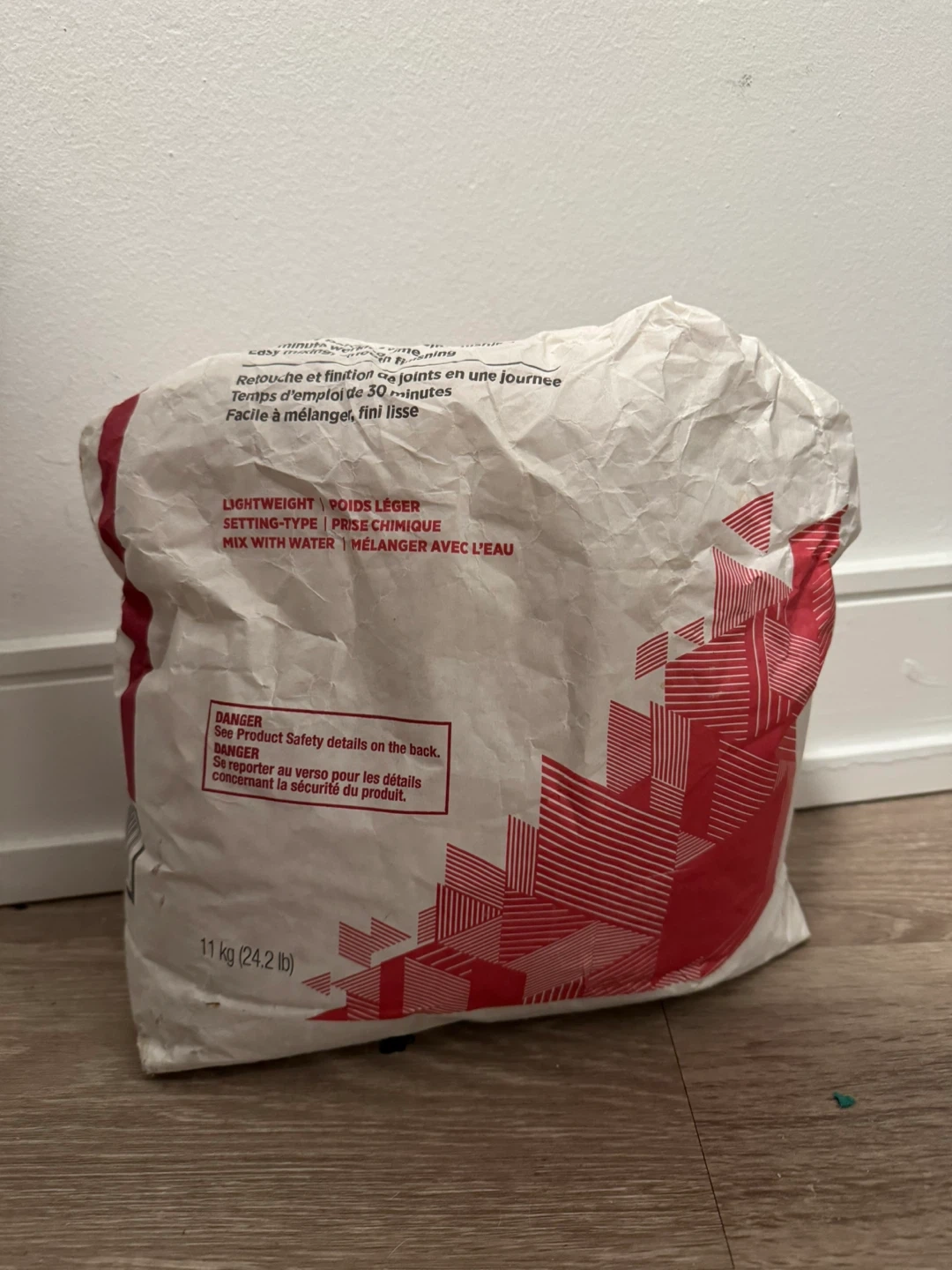 One-day patching and joint finishing with 30 minute working time. Easy mixing, smooth finishing. Lightweight. About a quarter left of a 11 kg (24.2 lb) bag