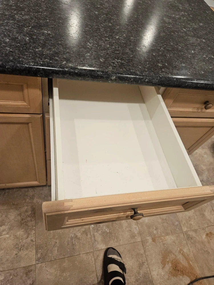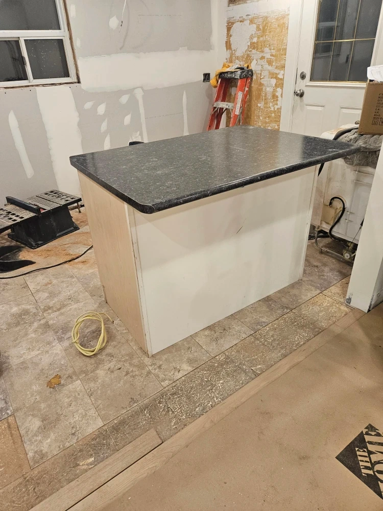 Selling a kitchen island with counter top. It features a cabinet door, three small and 2 large drawers for storage. It's in good condition and ready to use in your kitchen or workspace. Counter overhangs for bar seating.