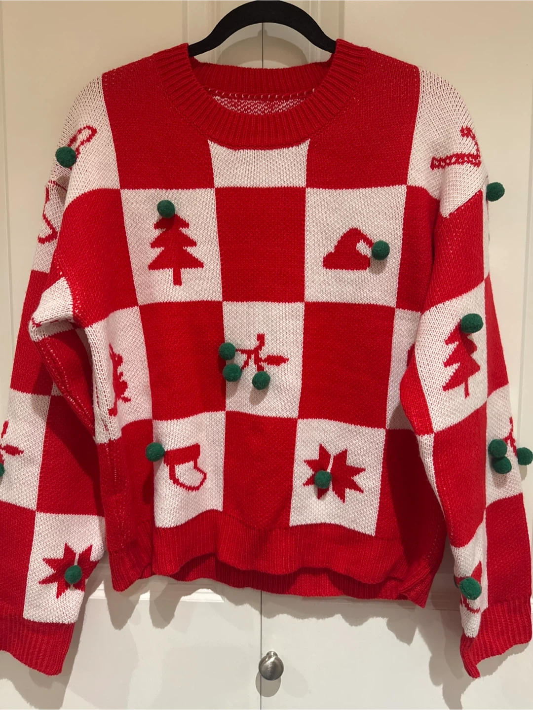 Festive red and white Christmas sweater with a checkered pattern. Features classic holiday symbols like Christmas trees, snowflakes, and Santa hats. Perfect for adding some cheer to your wardrobe this holiday season!