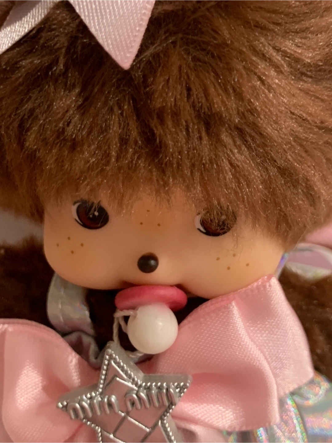 This adorable Monchhichi doll is dressed in a cute pink dress with a matching bow. It has a pacifier and a star charm. Perfect for collectors or as a sweet gift!