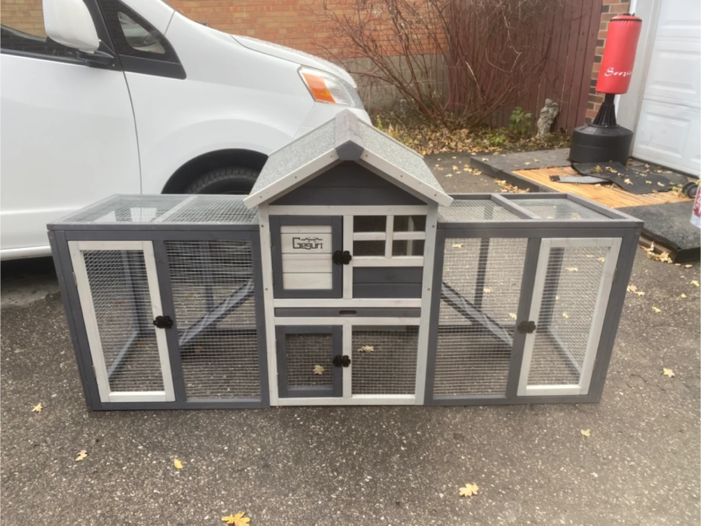 Selling a Gesuri chicken coop! It's in great condition and ready for some feathered friends. It features a grey and white design with wire mesh enclosures on either side of the main coop structure. Perfect for providing a safe and comfortable home for your chickens
