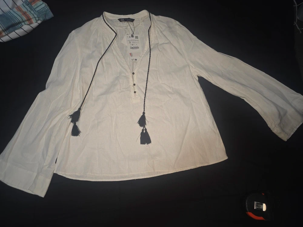 This is a Zara white blouse with linen material. It features tassel details and is a size small. It's in great condition and ready for a new wardrobe! Please check the pictures and my another list thank you