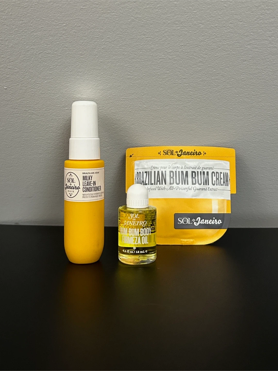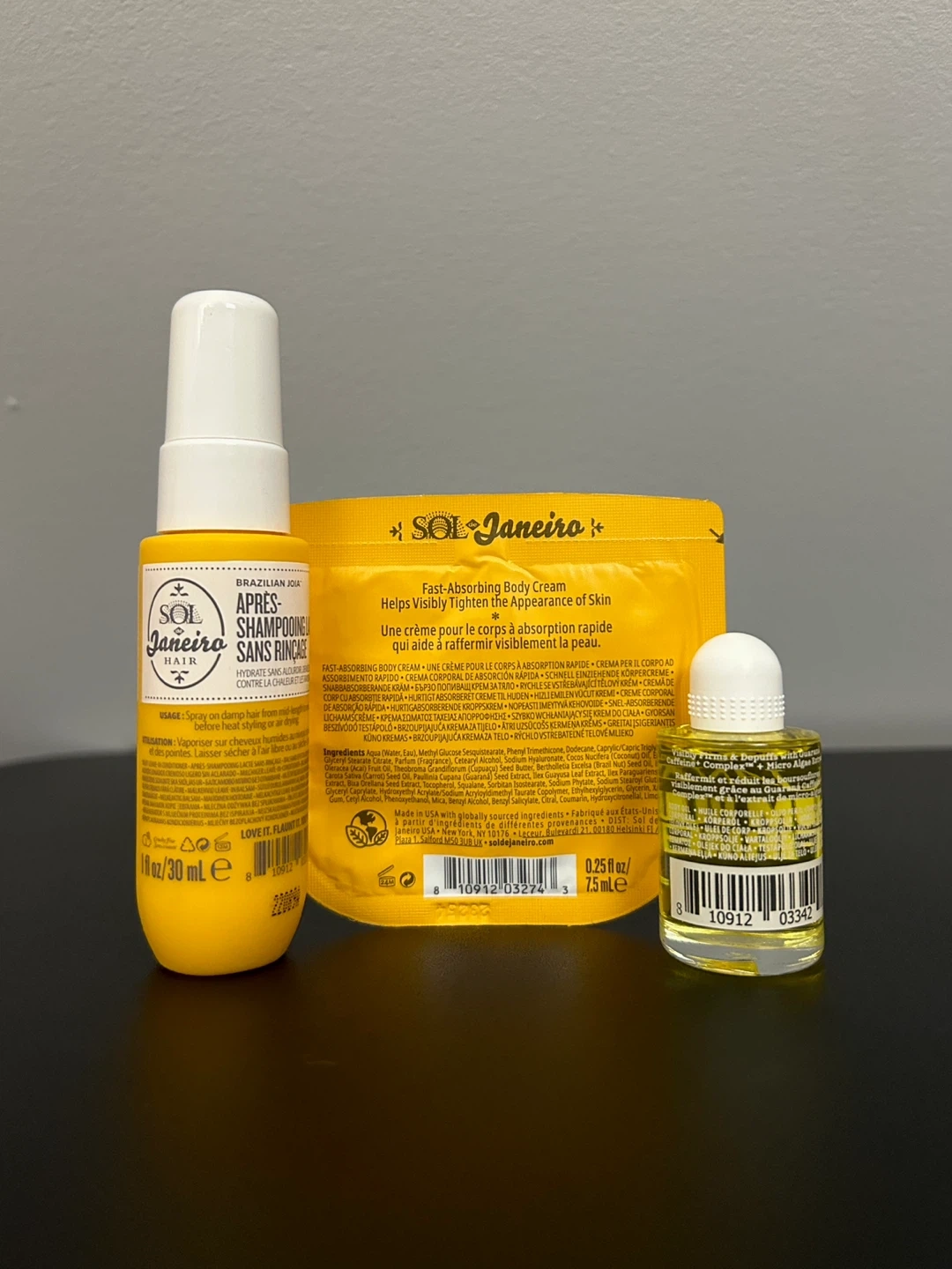 Sol de Janeiro Mini Set. Includes: Brazilian Joia Milky Leave-In Conditioner (30ml). Like new - only spray tested. Perfect for weightless hydration, frizz control, and heat protection for all hair types. Bum Bum Body Firmeza Oil (12ml). Brand new. Firming, de-bloating, and deeply nourishing non-greasy body oil. Brazilian Bum Bum Cream (7.5ml). Visibly firming body cream with caffeine-rich guaranà.