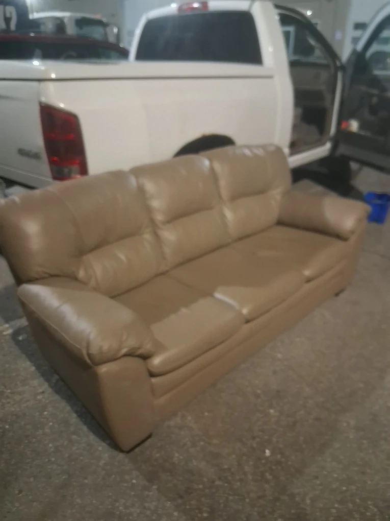 Selling a gently used tan leather love seat sofa. It's in good condition and ready for a new living room. Perfect for lounging and adding a touch of warmth to your space!