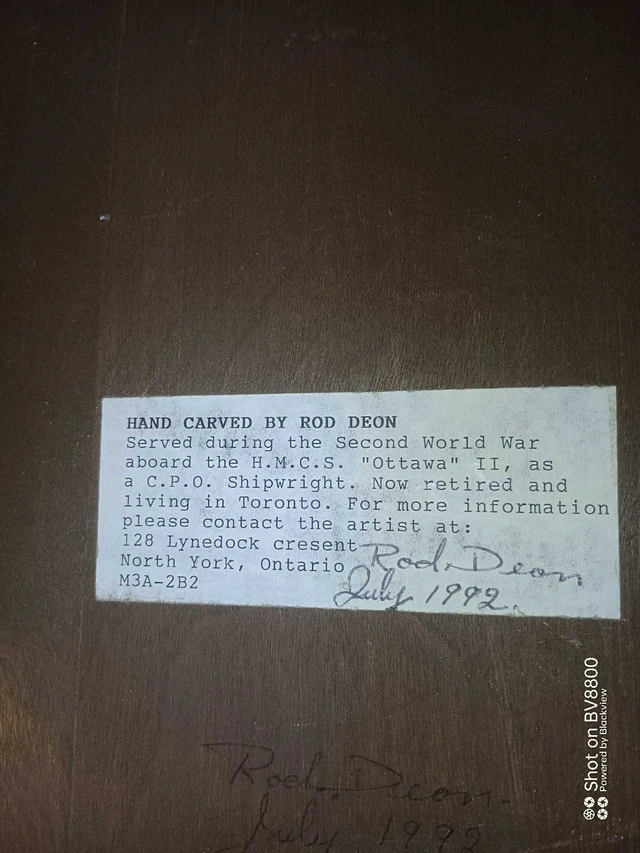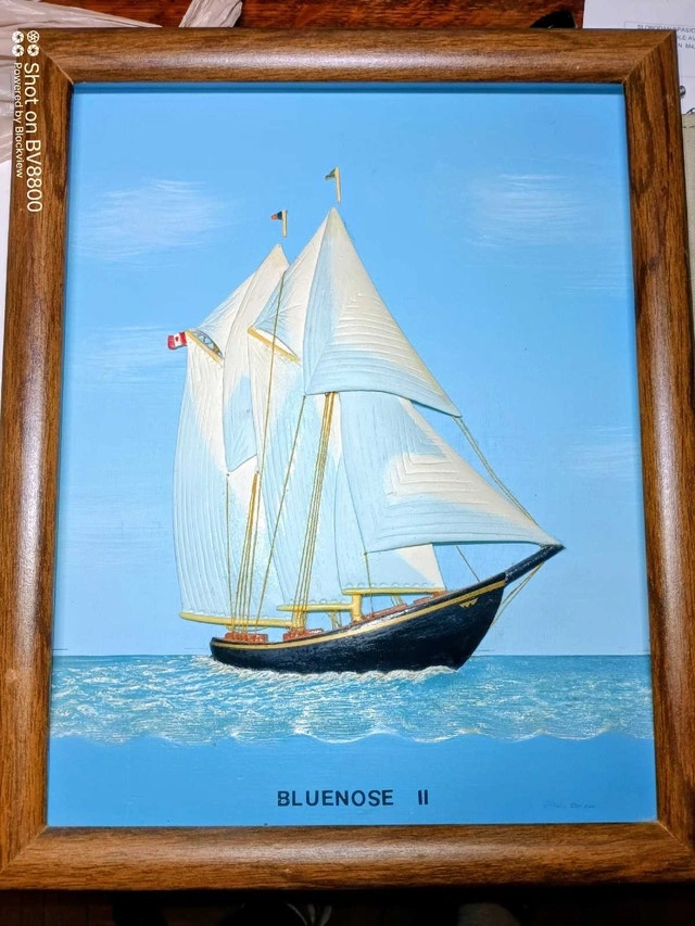 I'm offering a unique piece of maritime history with this hand-carved Bluenose II painting. Crafted during the Second World War by Rod Deon while serving aboard the H.M.C.S. Ottawa II, this artwork showcases the iconic schooner in remarkable detail. The piece is signed and dated July 1992. This painting captures the essence of naval craftsmanship.