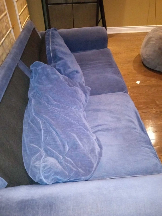 This is a used blue sofa. While it has provided a comfortable seating option, its condition reflects signs of use. Perfect for those seeking a budget-friendly furniture solution. Imagine the stories this sofa could tell if it could talk. But since it can't, I'll just let you know that if the ad's up, it's up for grabs!