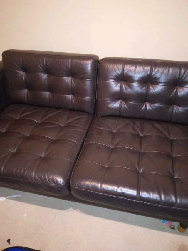 This used leather loveseat is a stylish and comfortable addition to any living space. Featuring a rich, dark brown leather upholstery with tufted cushions, it offers both elegance and durability. The compact size makes it perfect for smaller apartments or cozy nooks. While it has been gently used, it remains in good condition with some signs of wear that add to its character. Specifications: - Material: Genuine Leather - Colour: Dark Brown - Style: Tufted, Modern - Seating Capacity: 2 This loveseat is priced to sell, reflecting its used condition.