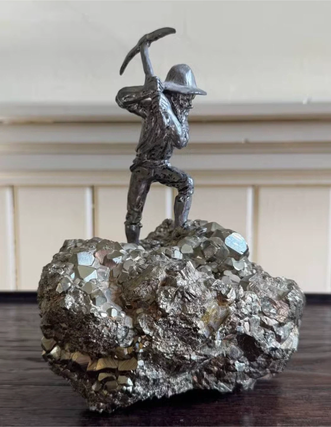 Selling a vintage sculpture of a miner on a pyrite base. It's a unique decorative piece that would look great in any home or office. The sculpture is in good condition and has a lot of character
