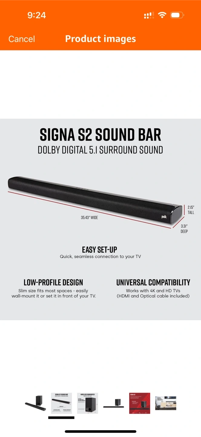 Selling a Polk Signa S2 ultra-slim sound bar and wireless subwoofer system! It delivers performance-tuned surround sound and is universally compatible with 4K and HD TVs. The system includes the sound bar, wireless subwoofer, and remote control. The sound bar is 35.43" wide, 2.15" tall, and 3.31" deep, while the subwoofer is 6.73" wide, 13.48" tall, and 12.30" deep. Enjoy powerful deep bass with this easy-to-set-up system!