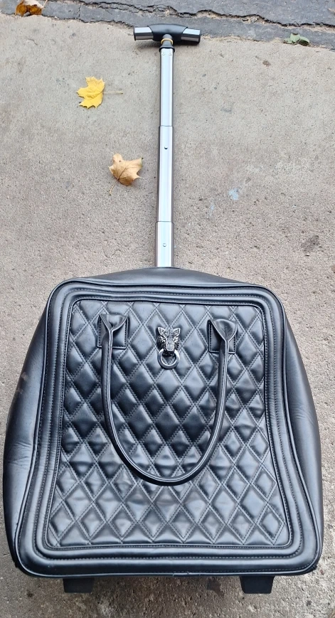 This is a black rolling carry-on bag. It has some signs of wear and tear on the corners, but it's still functional. Great for travel!