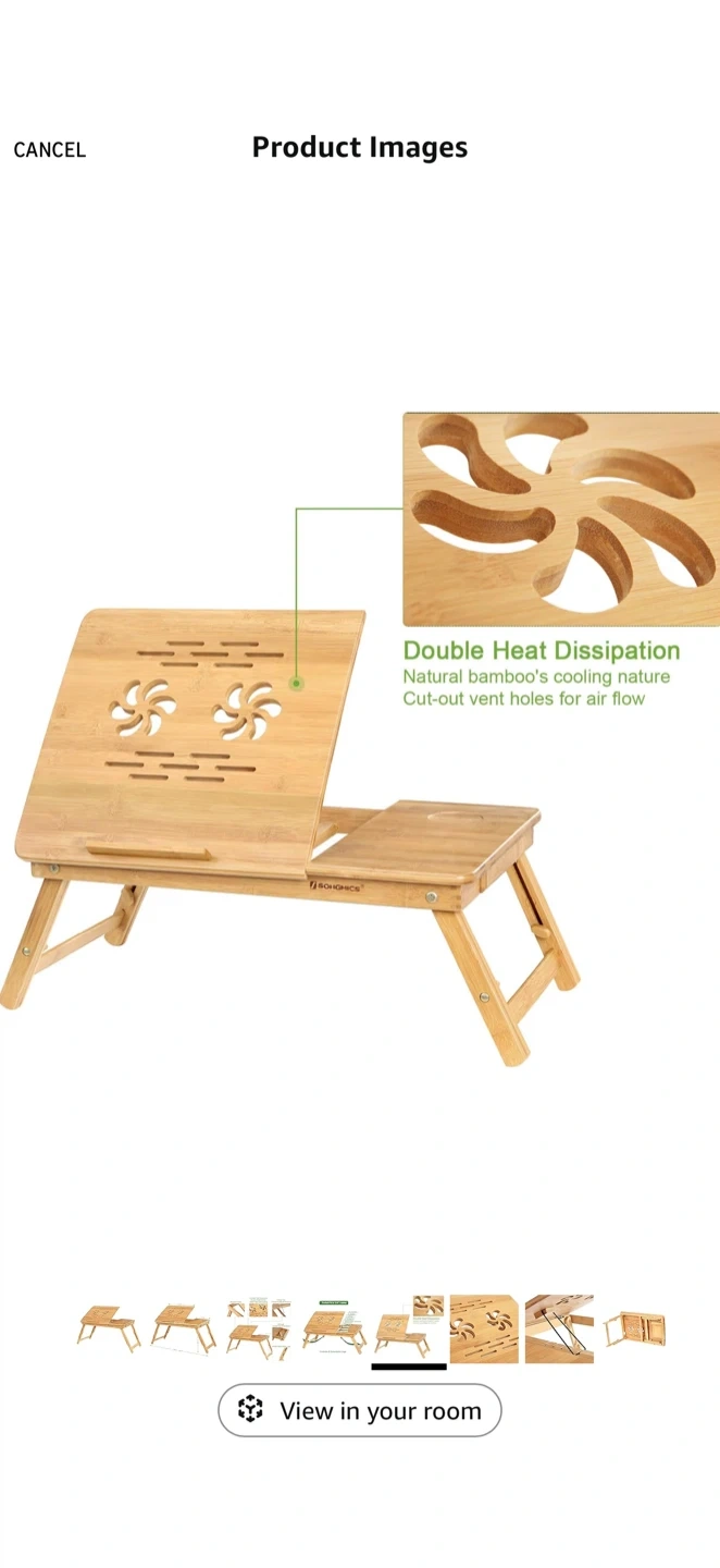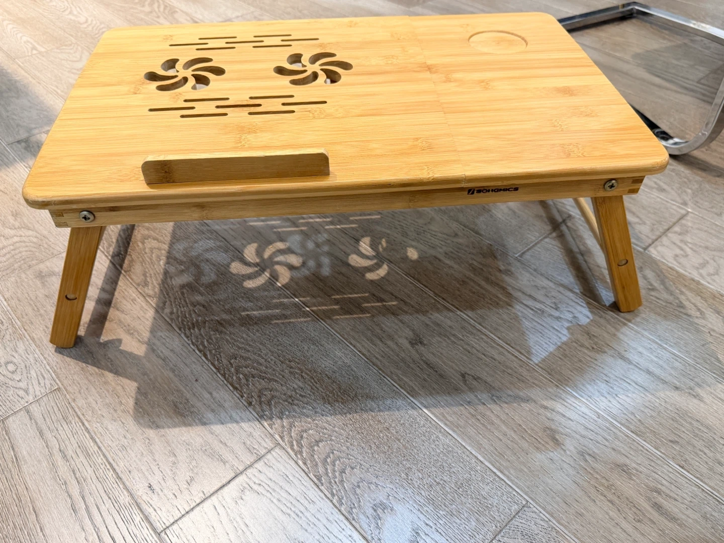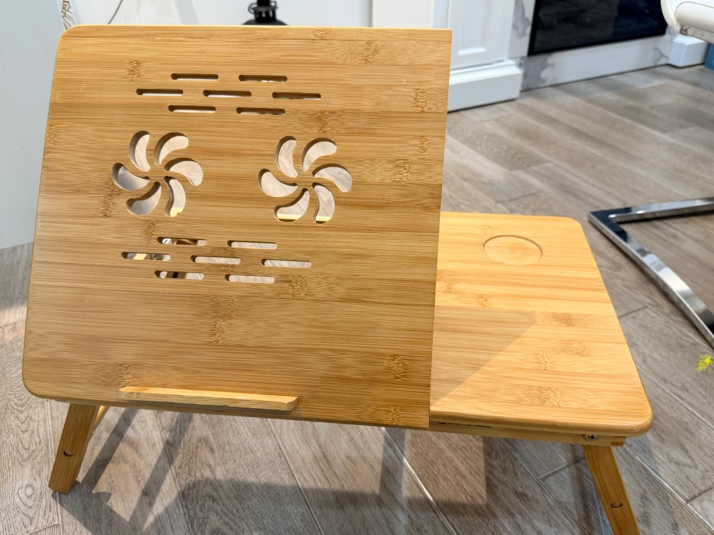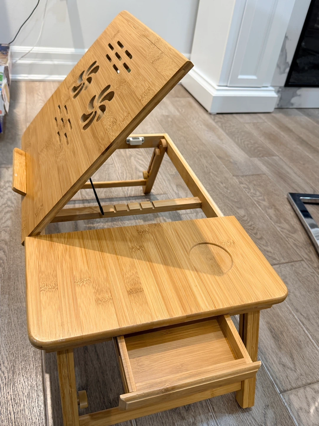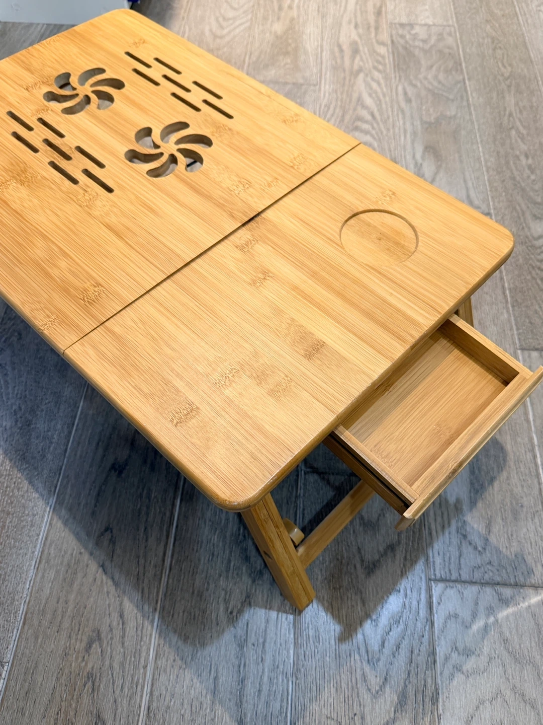 It's made of natural bamboo and has exquisite flower patterns for better heat dissipation. The tilting top has 5 slots to adjust the position, and there's a drawer for small items.