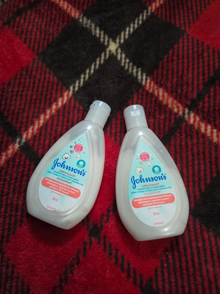 Donating/giving two mini bottles of Johnson's Cottontouch newborn face and body lotion. Each bottle contains 50mL of lotion. It's ultra light and moisturizes for 24 hours, keeping baby's skin soft and hydrated