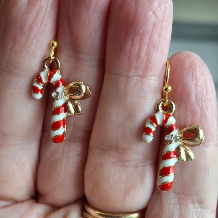 These cute earrings are perfect for the holiday season! They feature a candy cane design with red and white stripes and a little bow. They're ready to add some festive cheer to your outfit