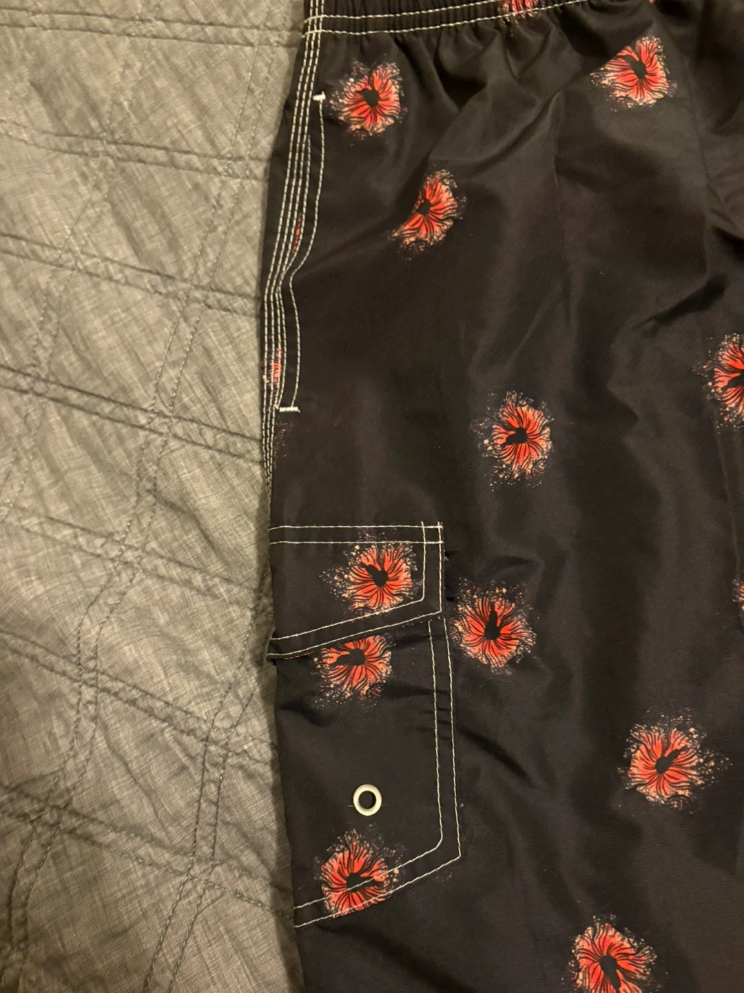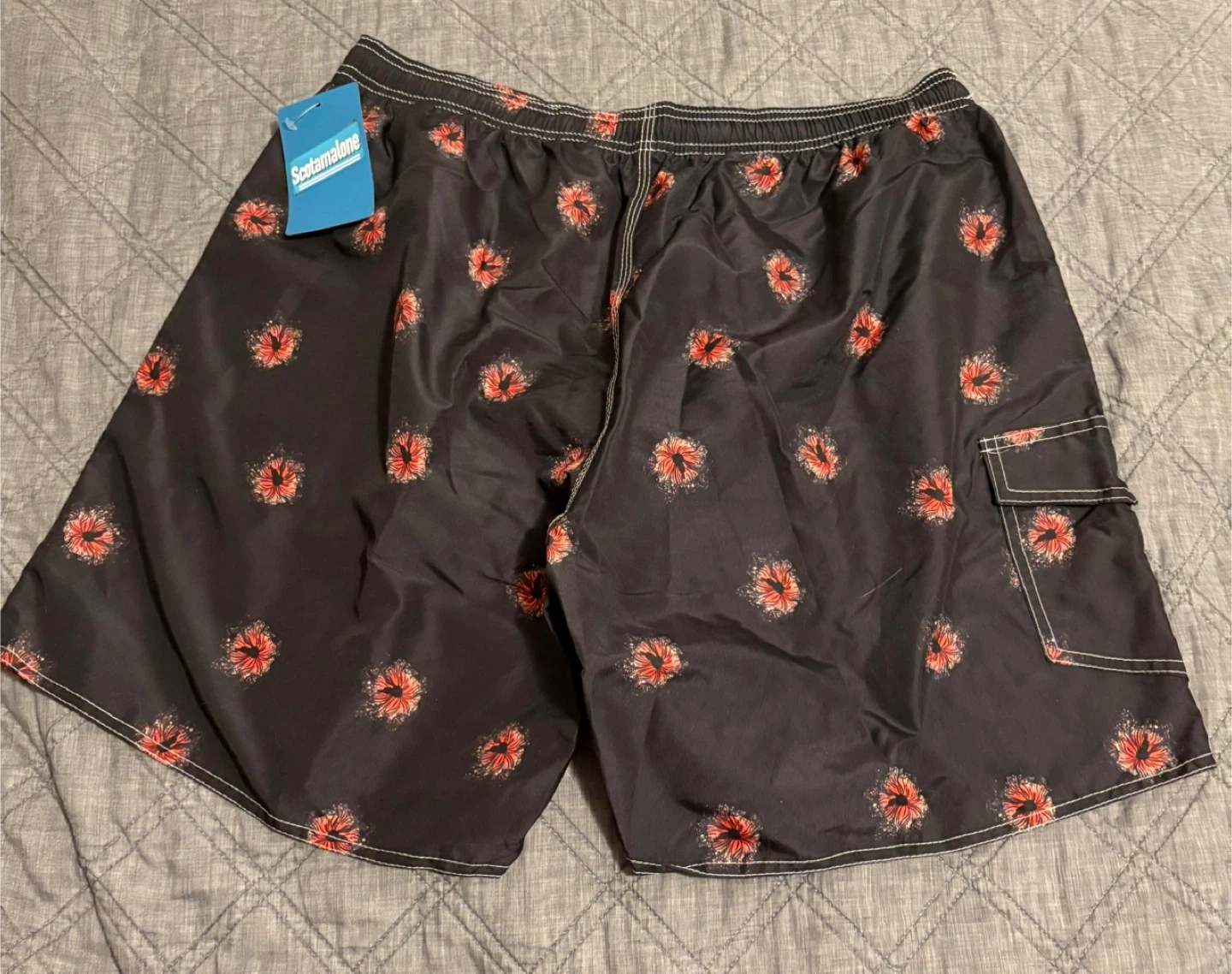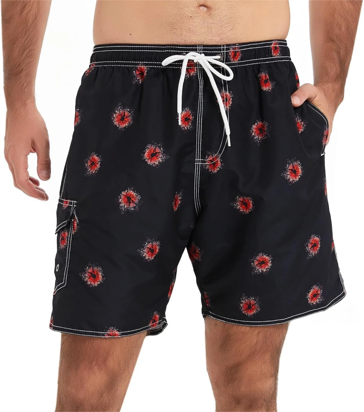 These swim trunks feature a stylish floral pattern on a black background. They have a comfortable elastic waistband with a drawstring and a convenient cargo pocket. Perfect for a day at the beach or pool!